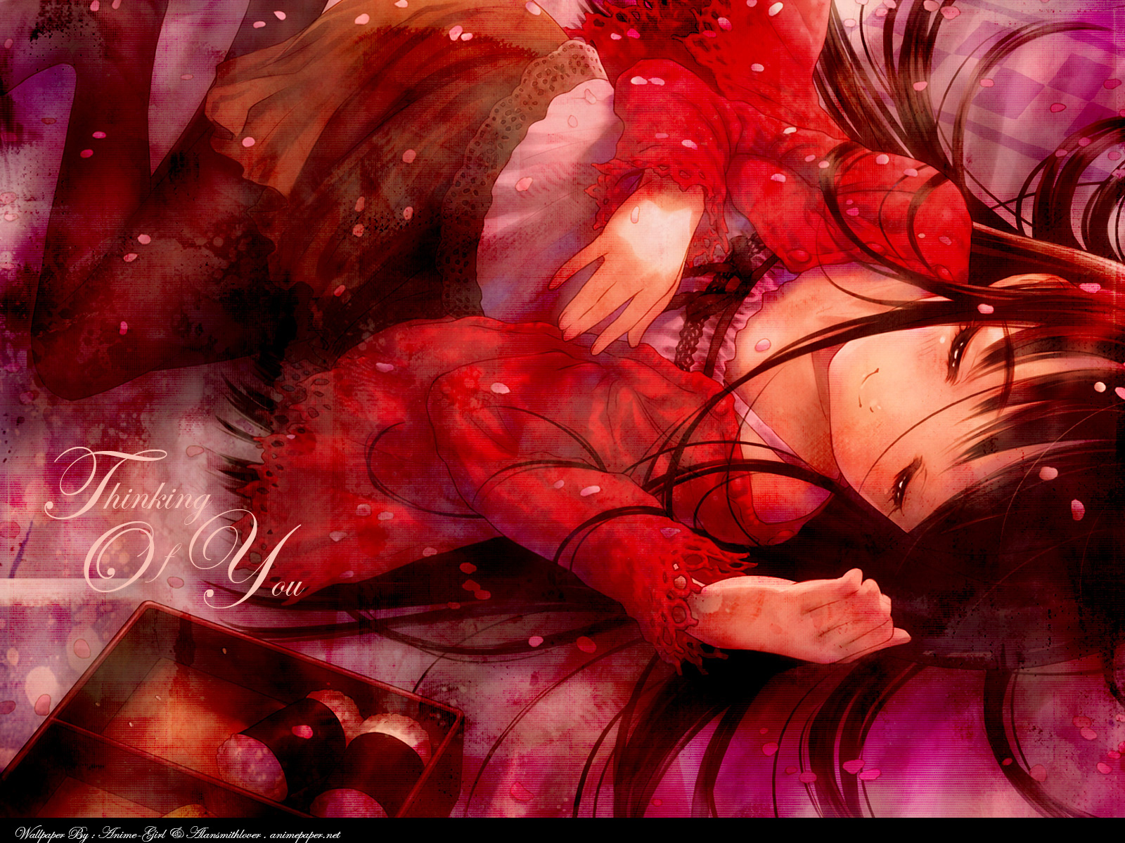 Description: A woman in a red dress laying on a bed with her eyes closed and her hair blowing in the wind.