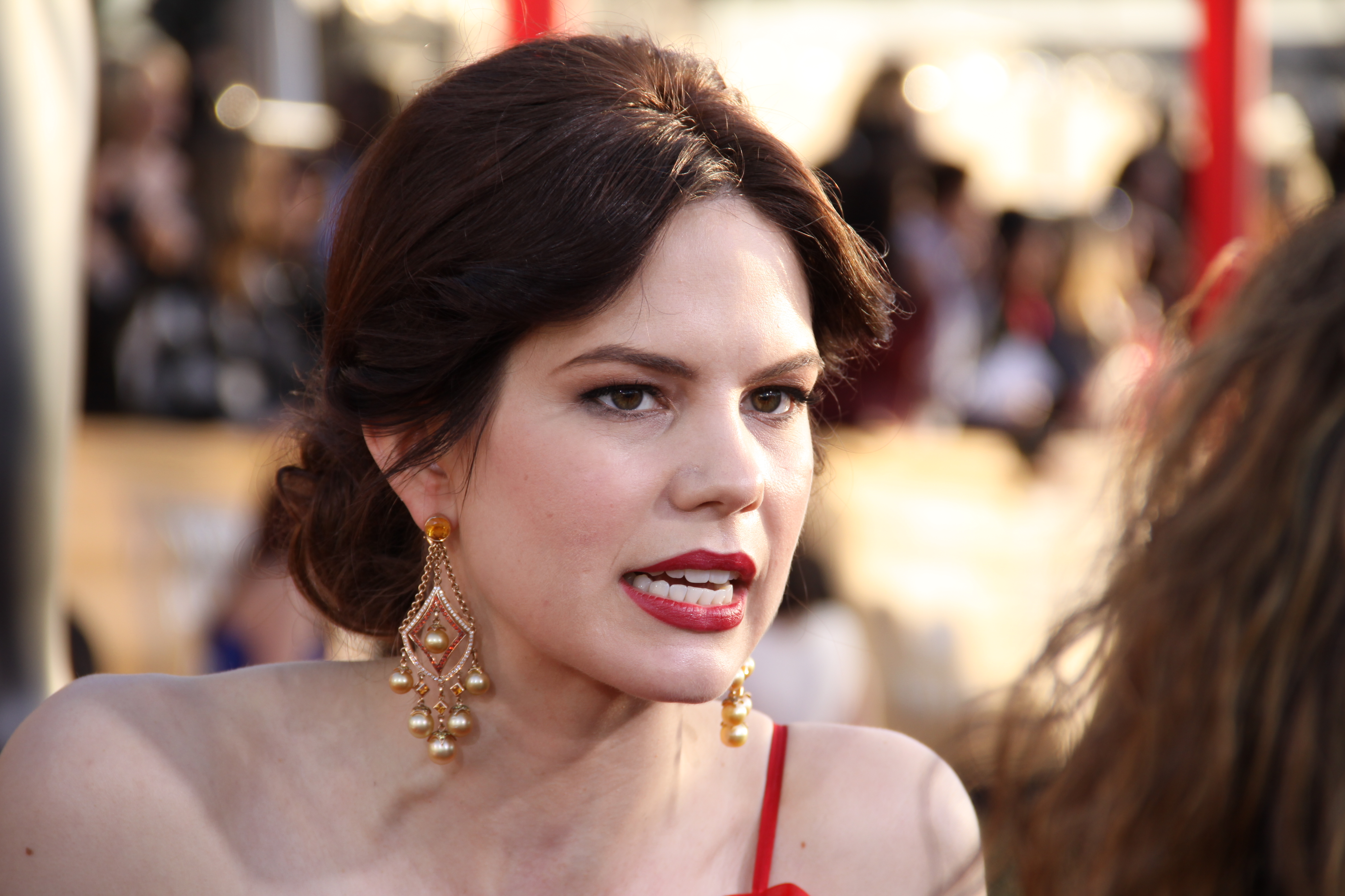 Description: A woman in a red dress with a red lip and earrings on her head and a red dress with a red dress on.