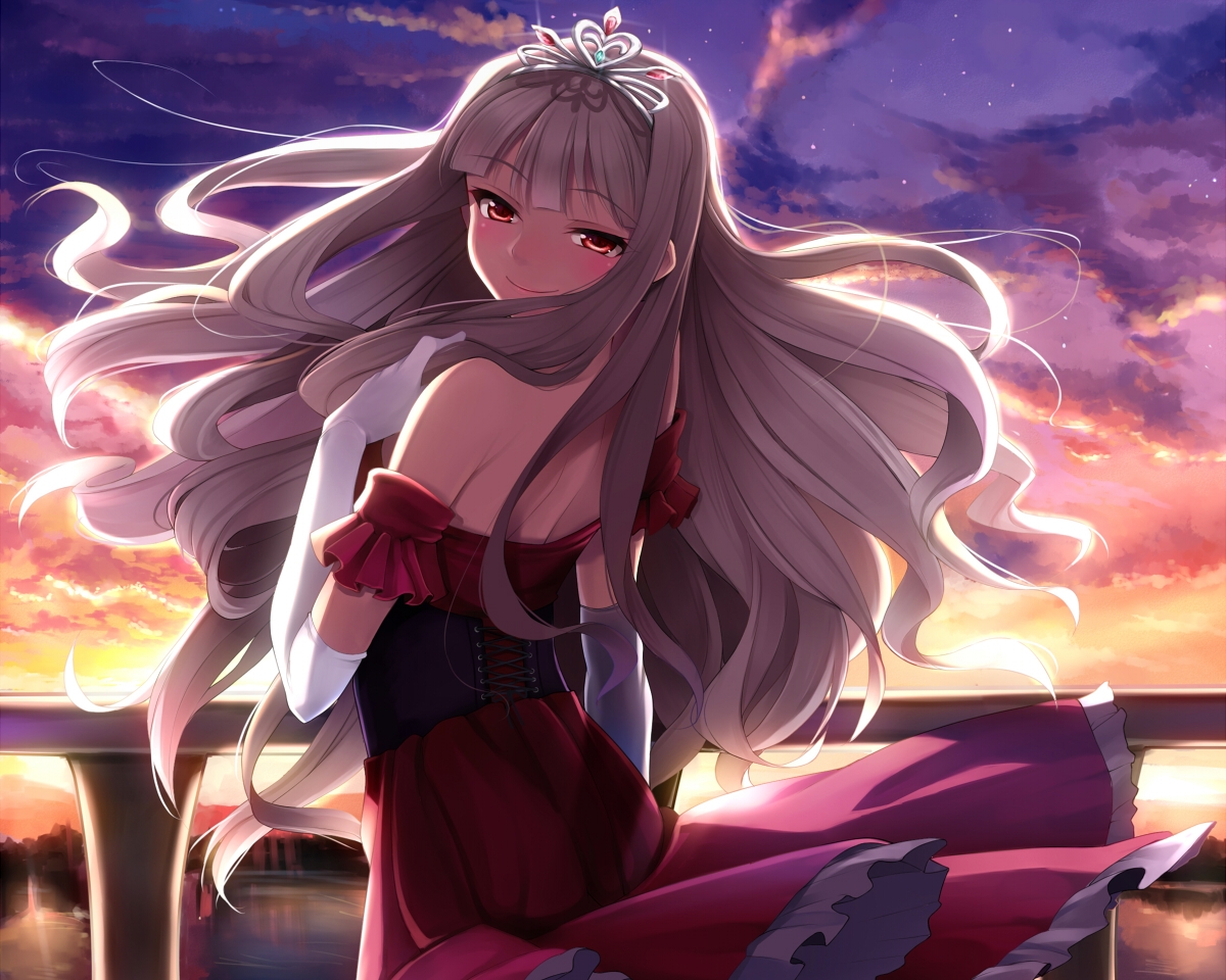 Description: A woman in a red dress sitting on a ledge with a sky background and clouds in the background.