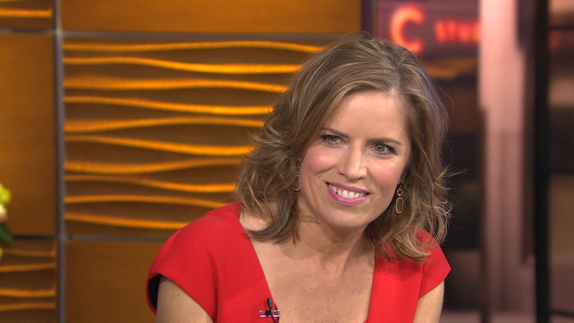 Description: A woman in a red dress is smiling for the camera while sitting down on a news set with a vase of flowers.