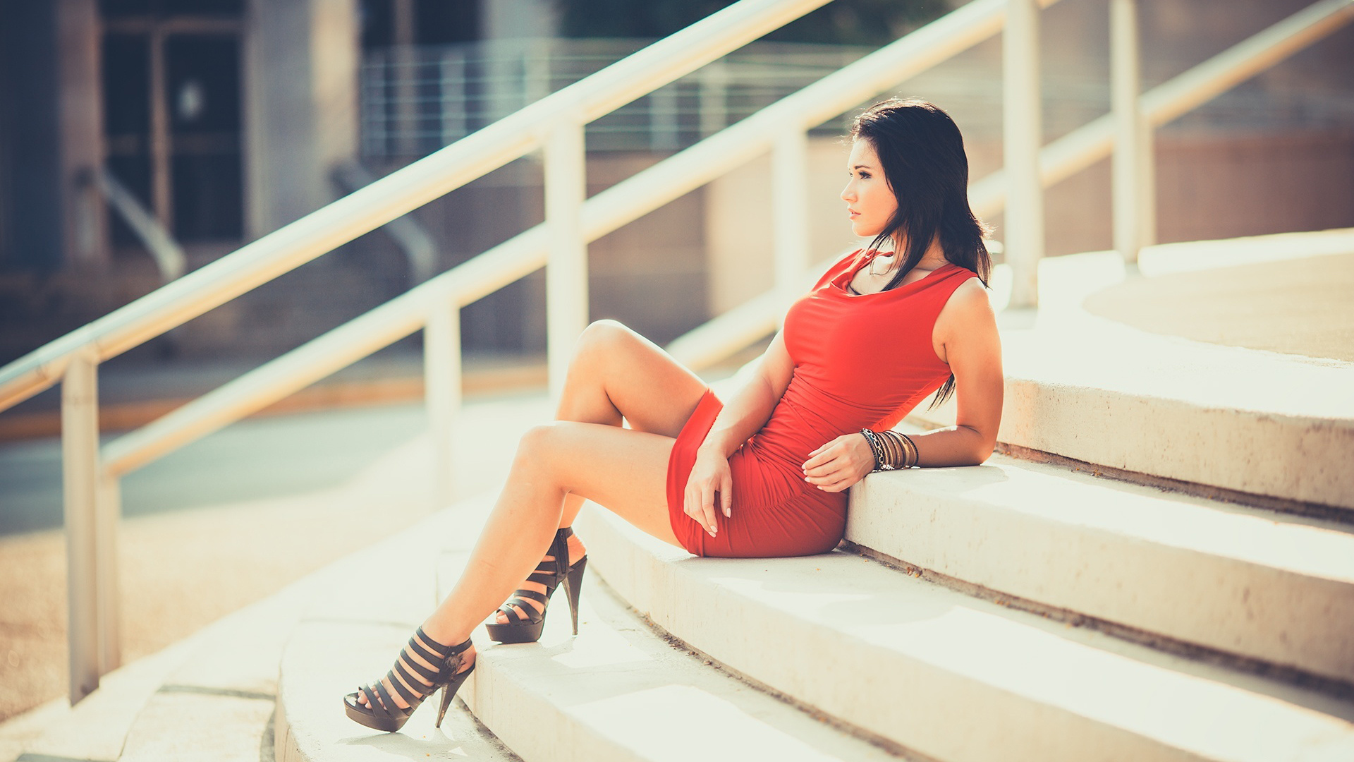 Description: A woman in a red dress sitting on a set of stairs with her legs crossed and her legs crossed.