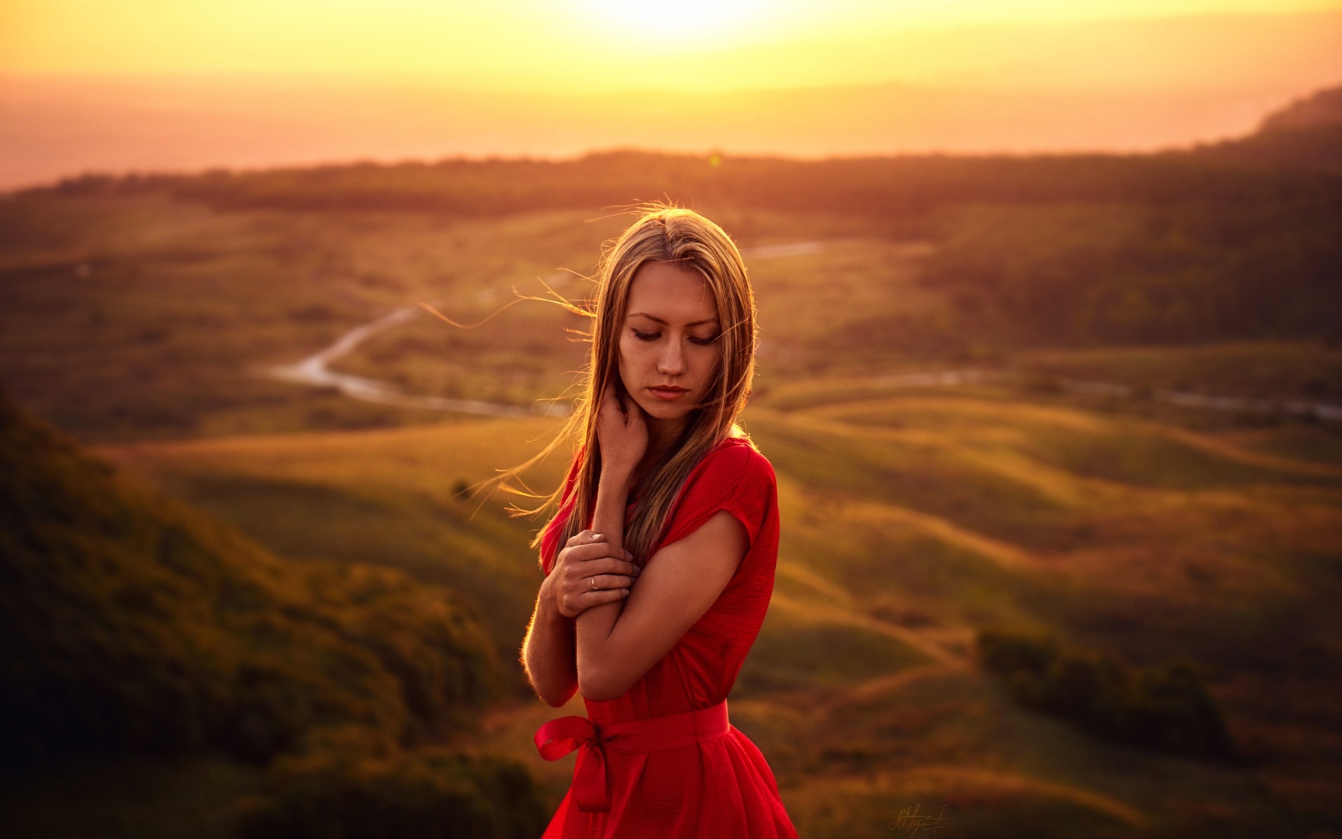 Description: A woman in a red dress standing in a field at sunset with her hands on her face and her eyes closed.