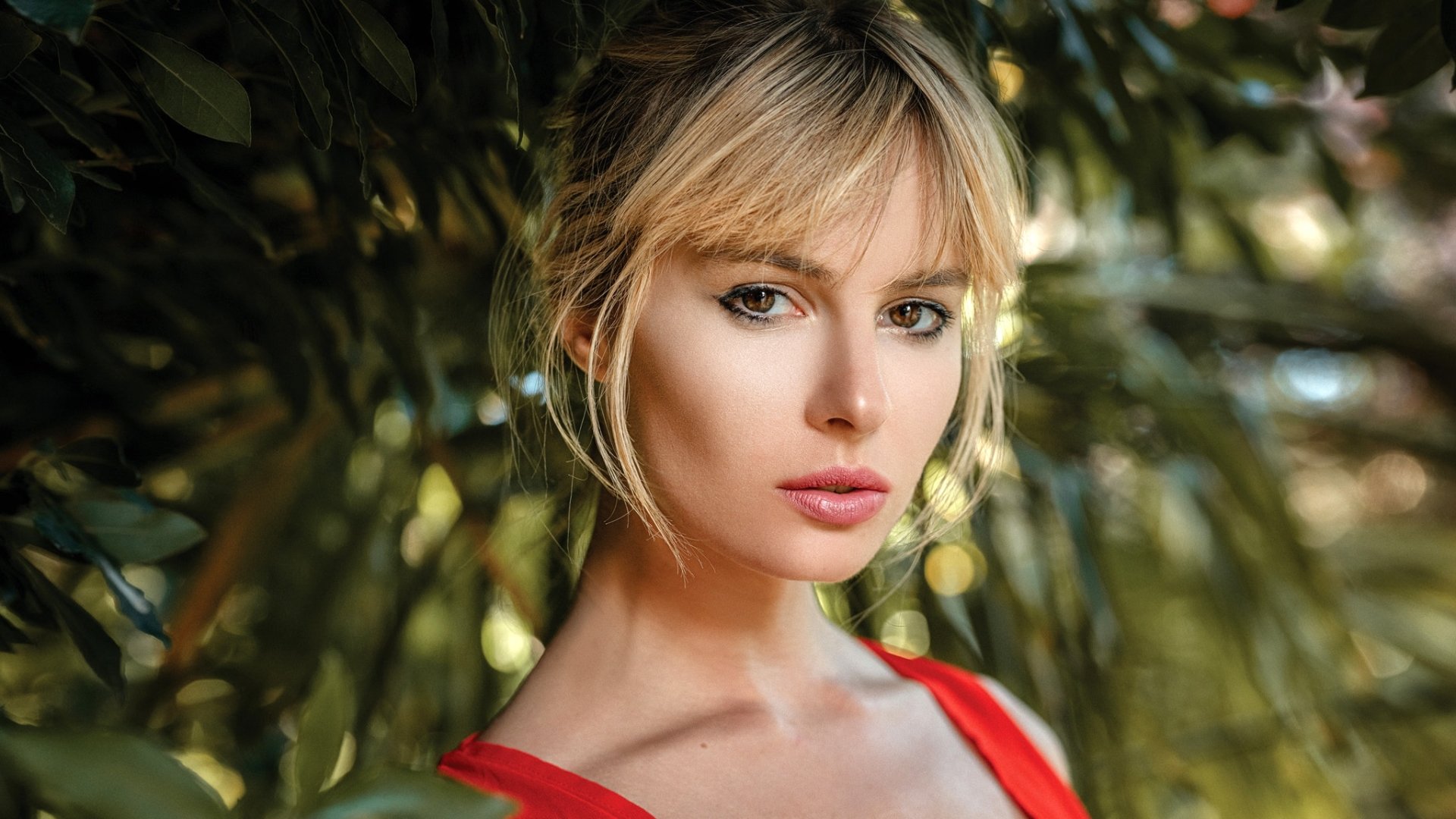 Description: A woman in a red dress is posing for a picture in a tree branch with her eyes closed and her hair pulled back.