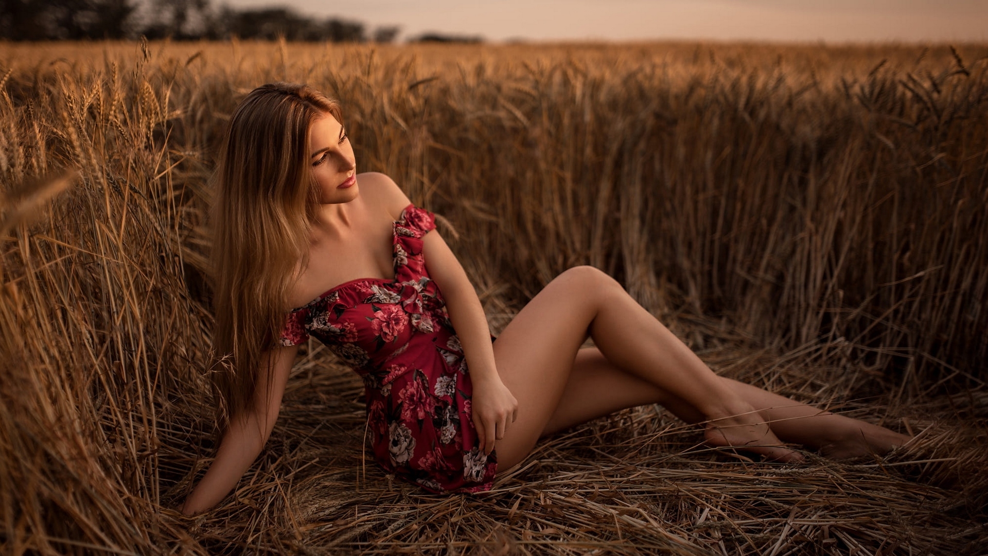 Description: A woman in a red dress sitting in a field of wheat looking off to the side with her legs crossed.
