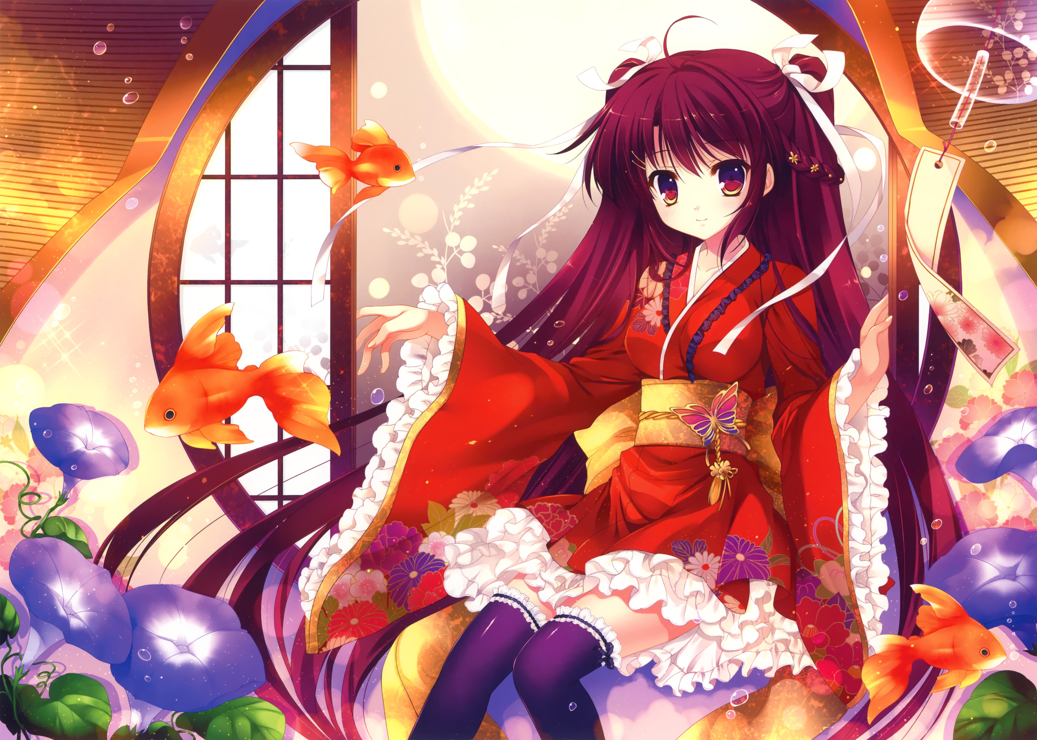 Description: A woman in a red dress sitting on a window sill with a fish in her hand and a fish in her hand.