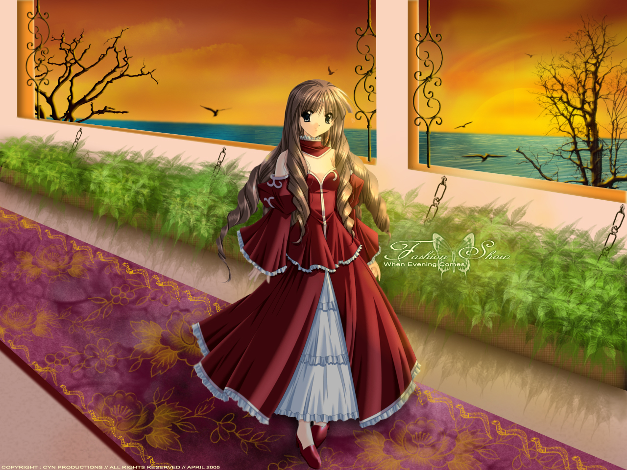 Description: A woman in a long red dress standing in front of a window with a sunset view behind her and a bird flying overhead.