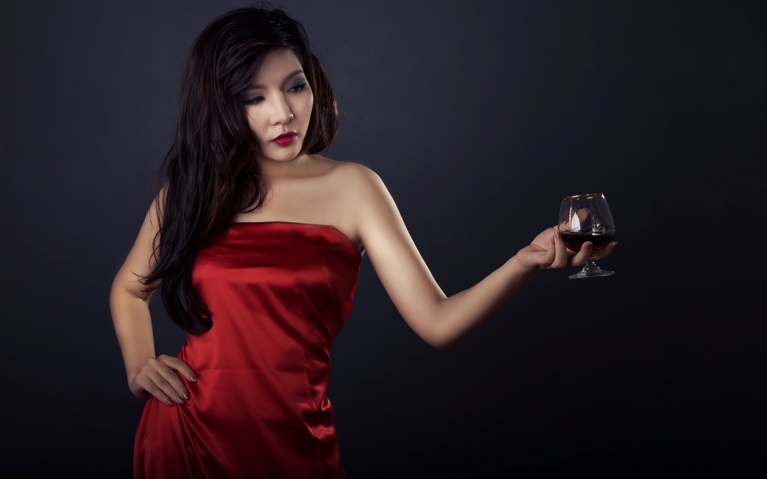 Description: A woman in a red dress holding a glass of wine in her hand and looking at the camera with a serious look on her face.
