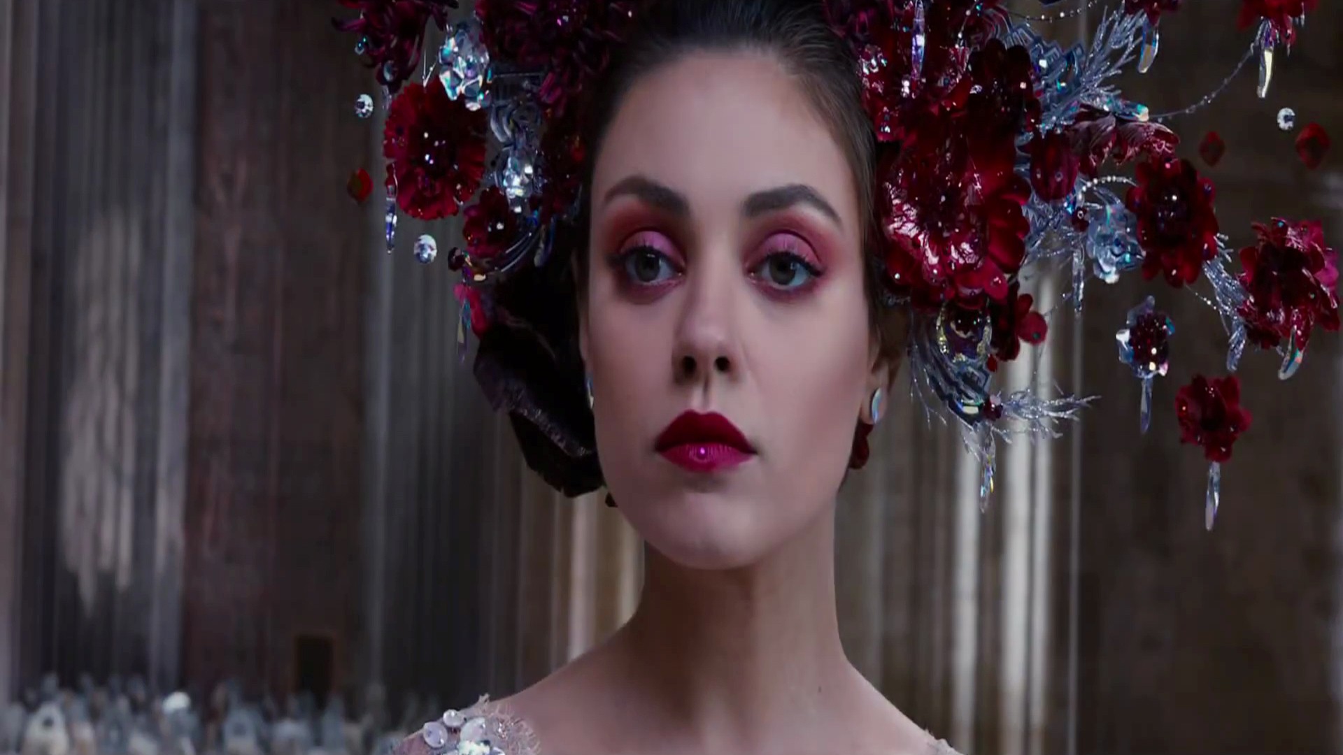 Description: A woman with a red flower in her hair and a red dress with a red flower in her hair.