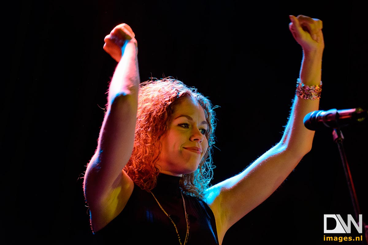 Description: A woman with red hair and a black top on a stage with a microphone and a microphone in her hand.