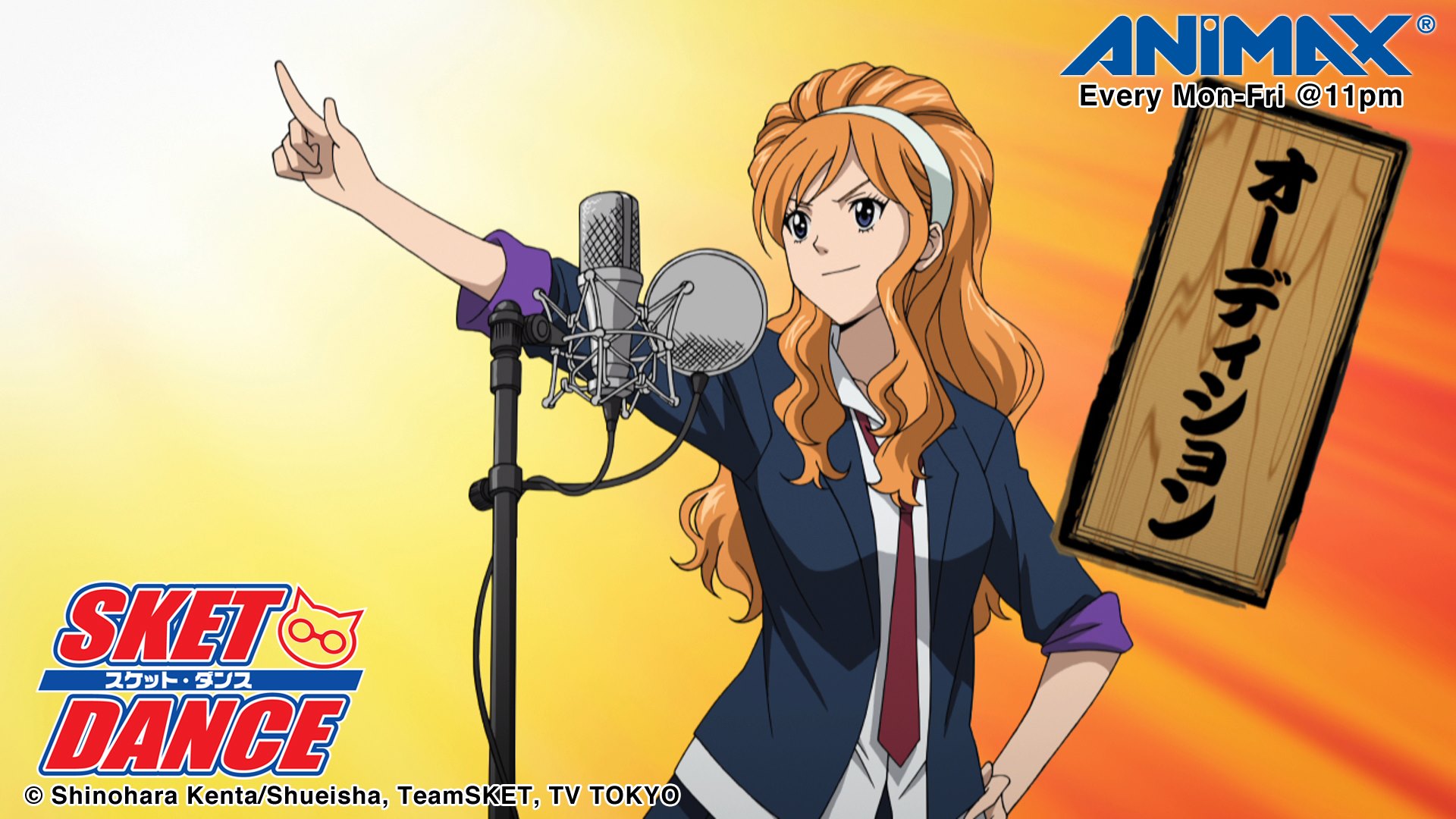 Description: A woman with long red hair holding a microphone and a sign that says sket to dance on it.