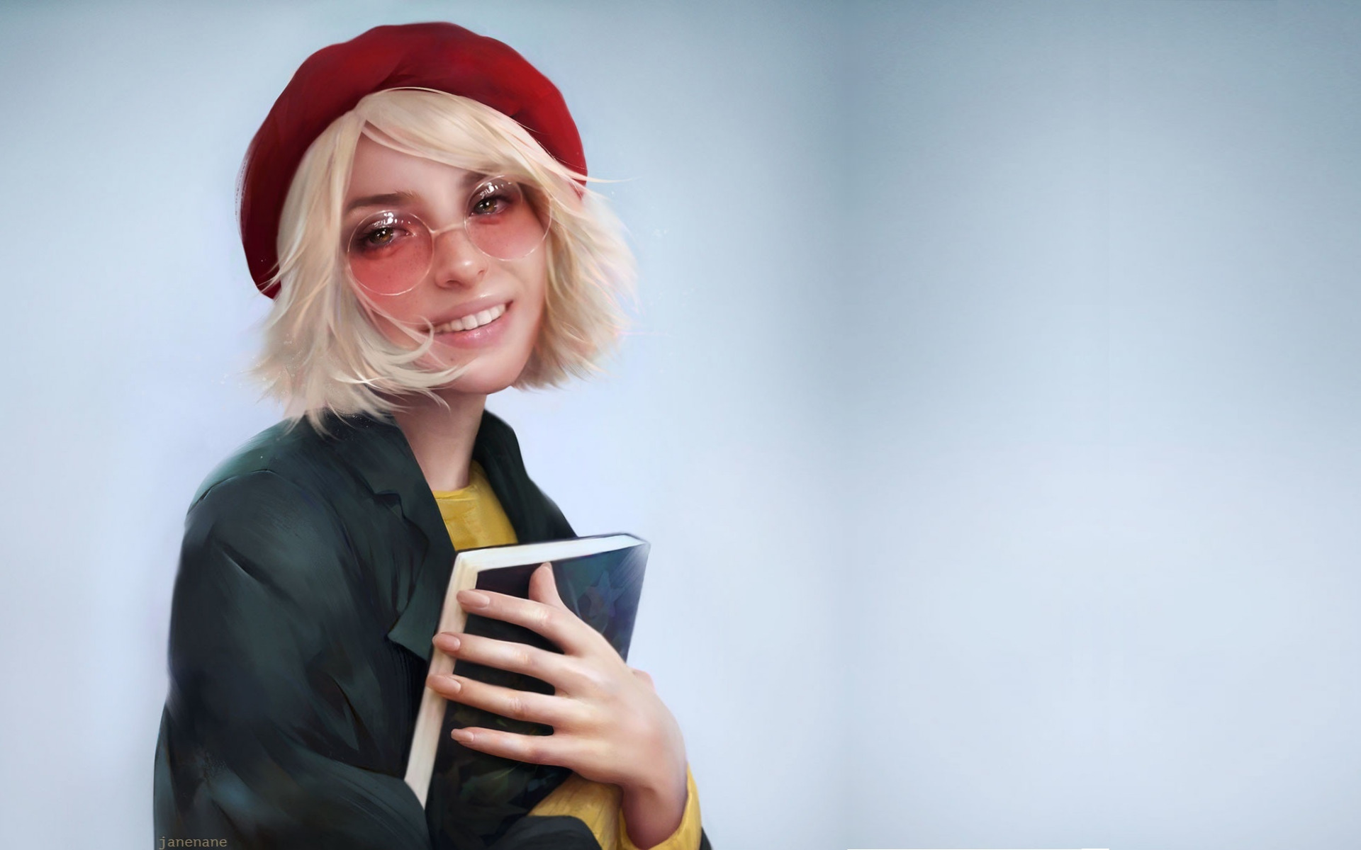 Description: A woman with a red hat and glasses holding a book and smiling at the camera with a laptop on her lap.