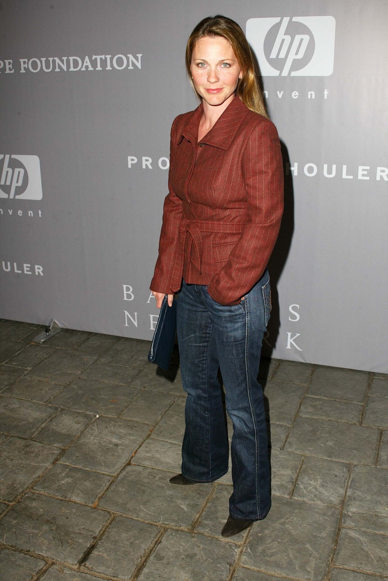 Description: A woman in a red jacket and jeans standing on a brick floor with a handbag in her hand.