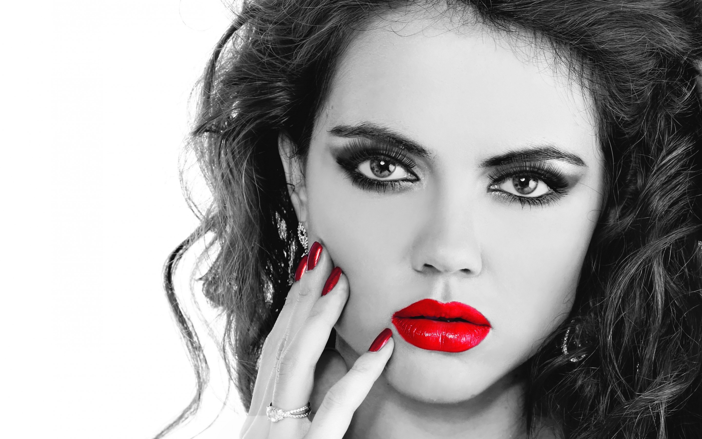 Description: A woman with red lipstick and black and white makeup is posing for a picture with her hands on her face.