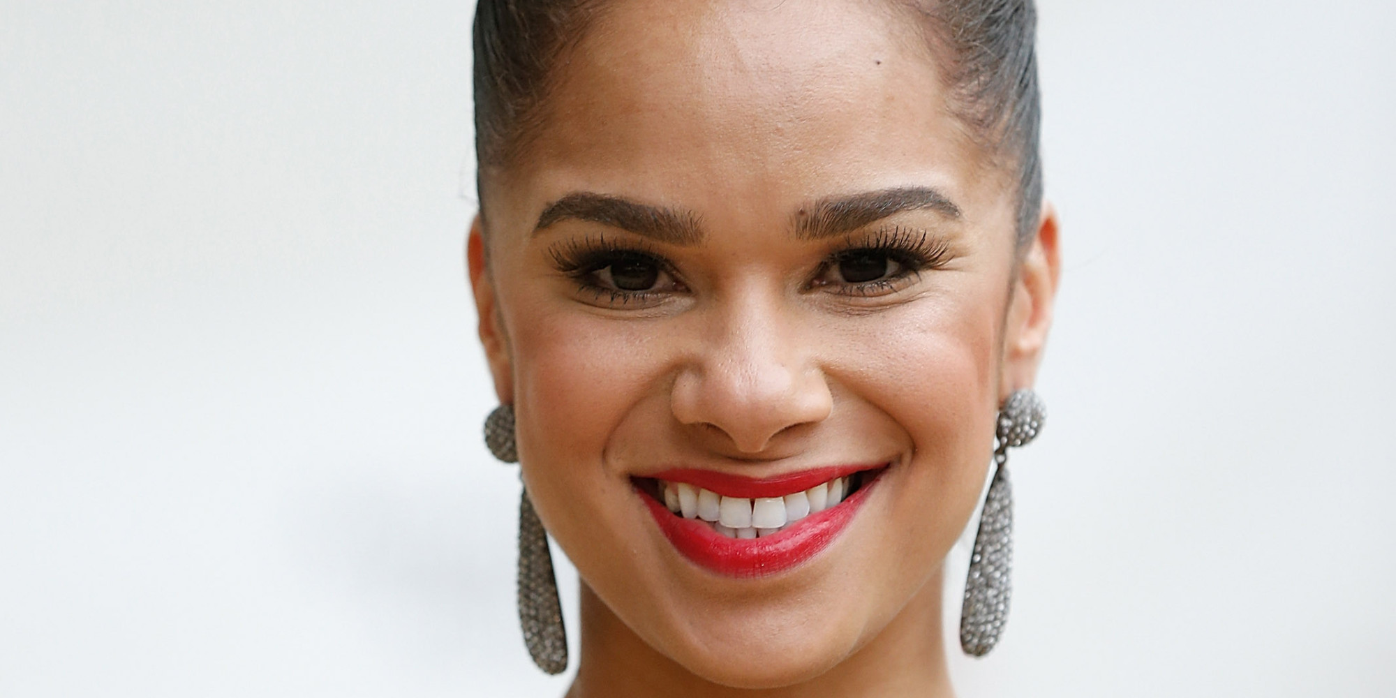 Description: A woman with a red lipstick and large earrings on her head smiling at the camera with a white background.