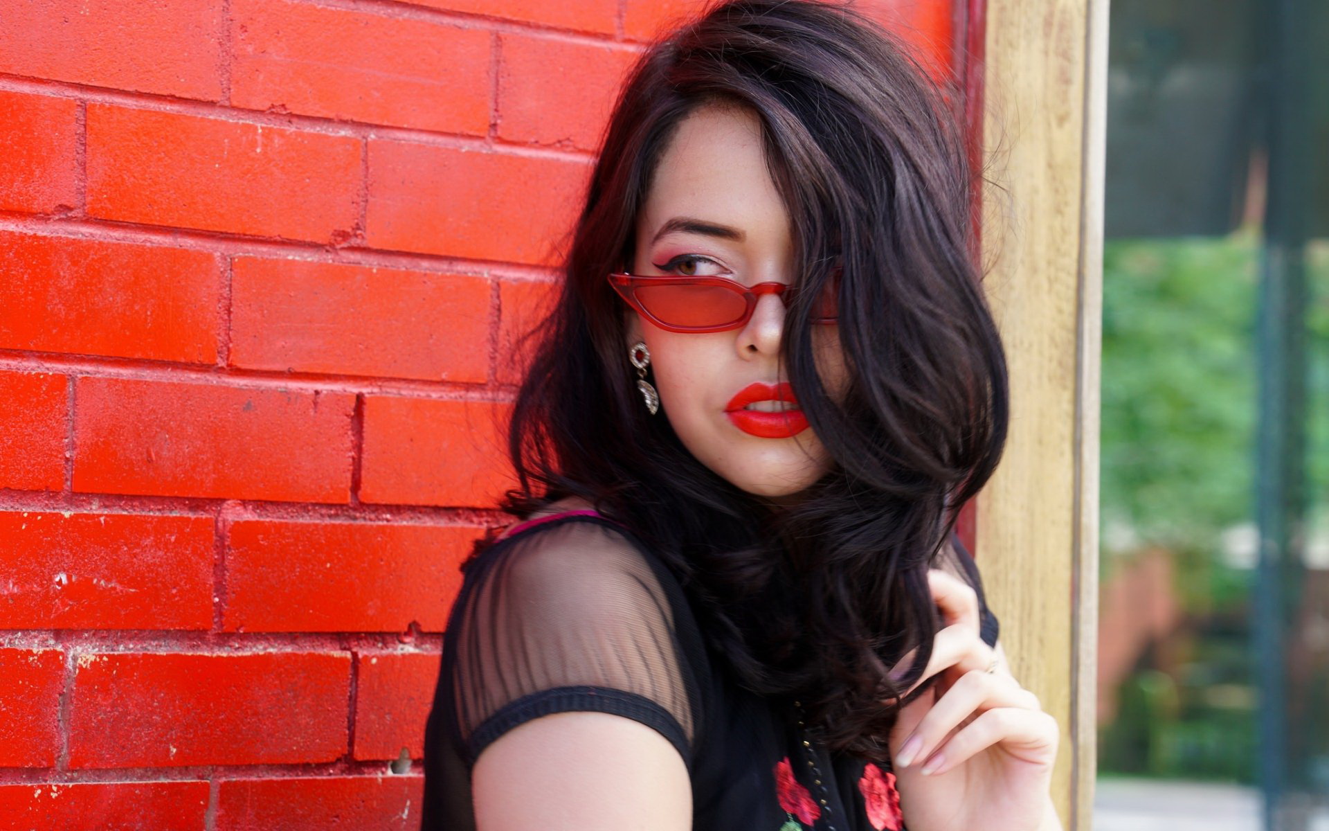 Description: A woman with red lipstick and sunglasses on posing for a picture in front of a brick wall with a red brick wall.