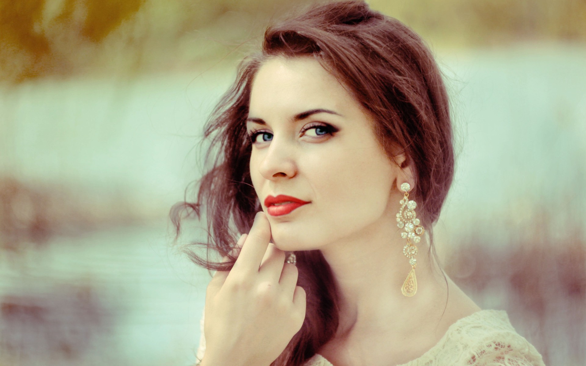Description: A woman with a red lipstick and a white dress is posing for a picture with her hand on her chin.