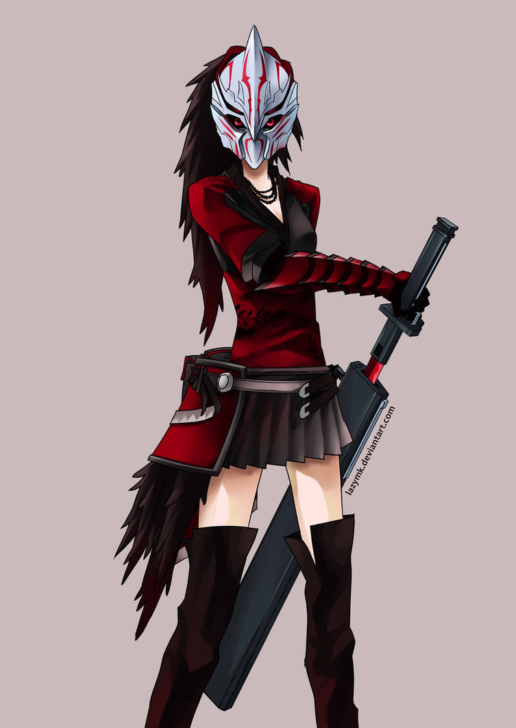 Description: A woman in a red outfit holding a gun and a knife in her hand and a sword in her other hand.