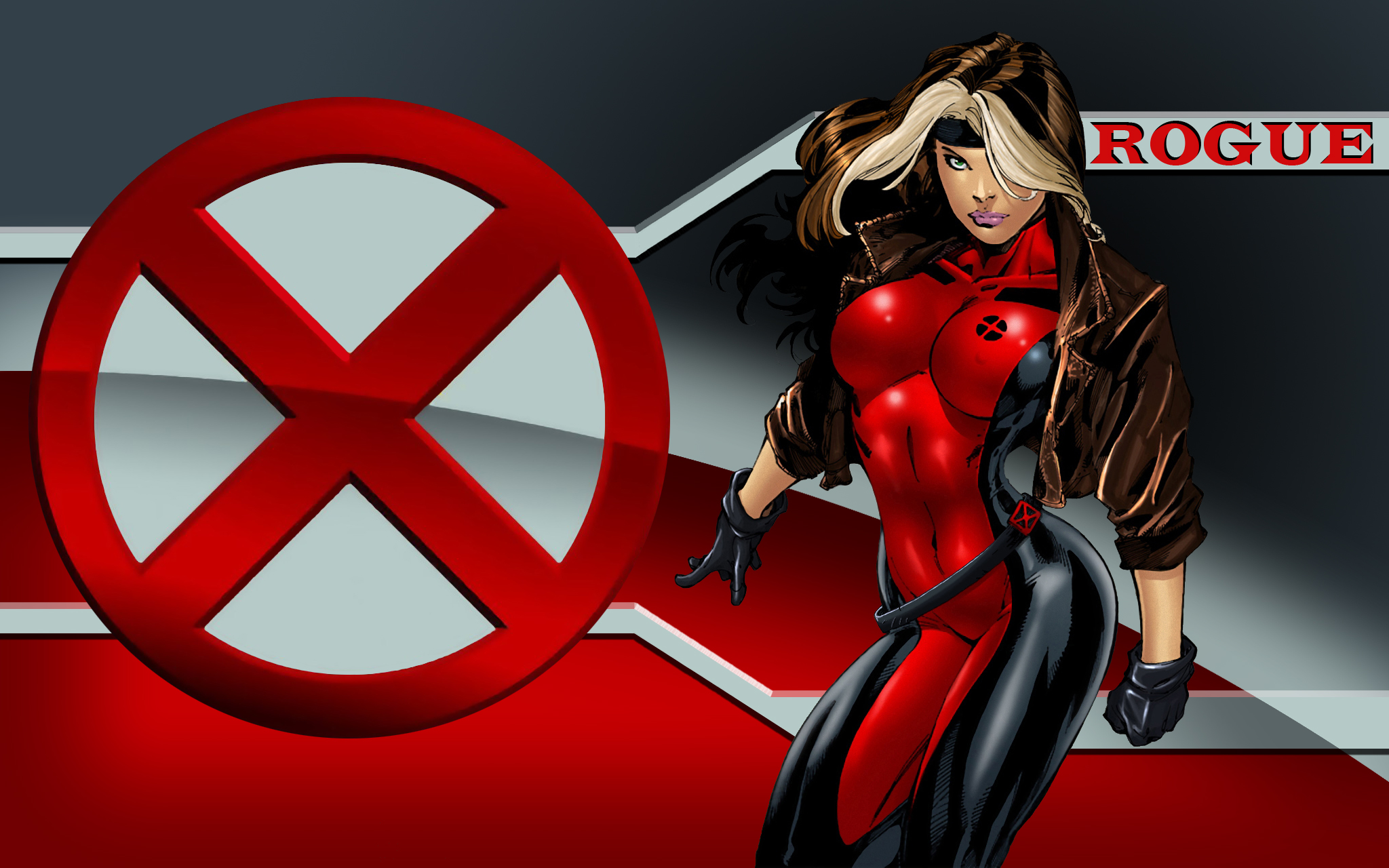 Description: A woman in a red outfit is standing in front of a red sign with a red x on it.