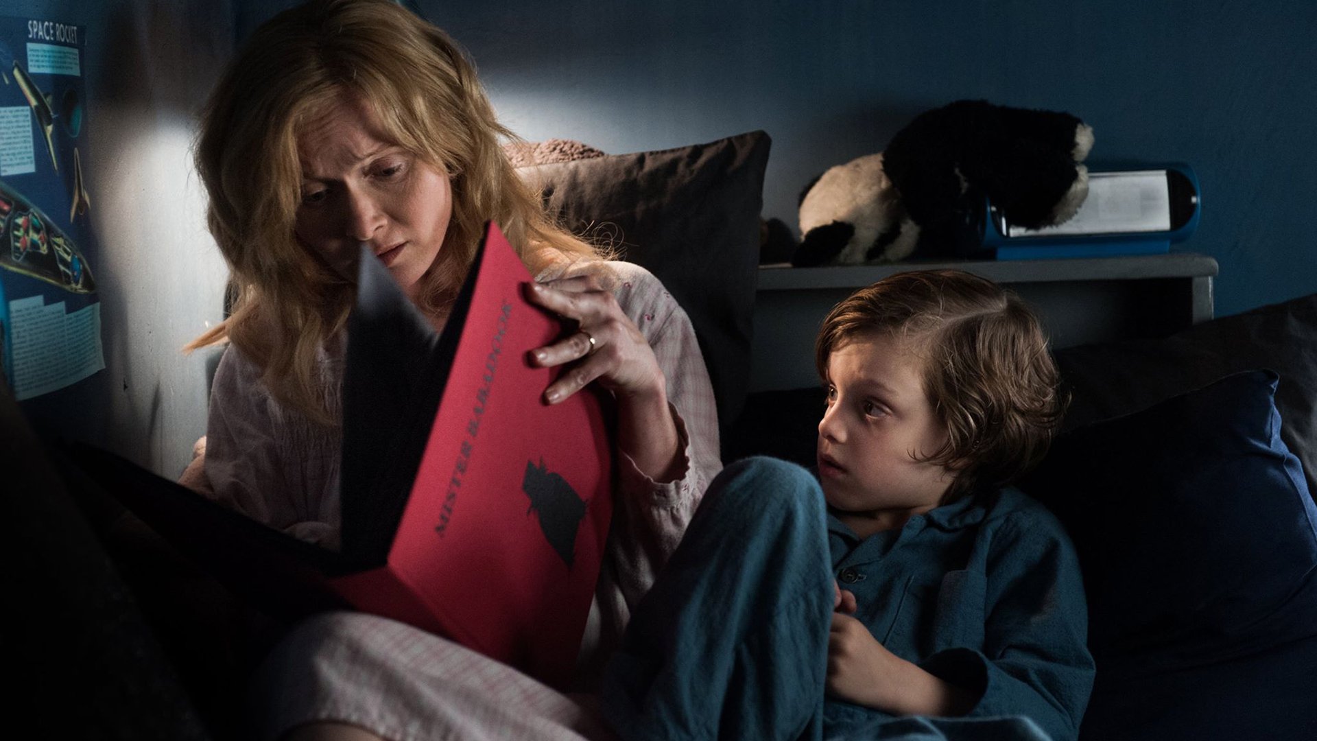 Description: A woman holding a red pillow next to a child on a bed with a cat on the wall behind her.