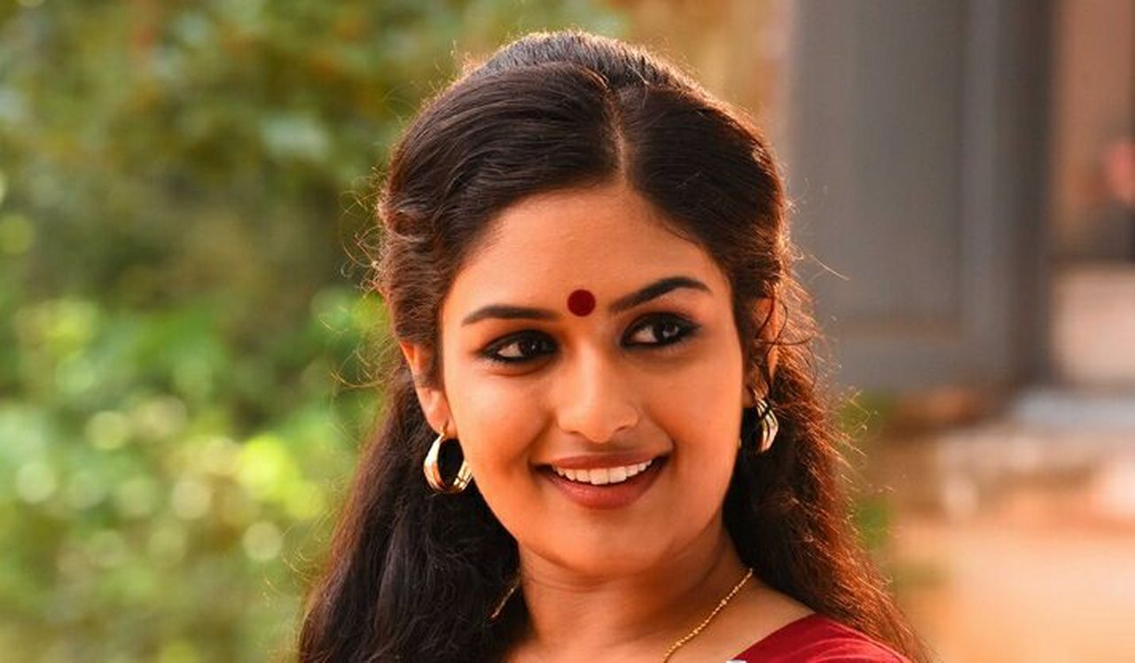 Description: A woman with a red sari and gold jewelry smiling at the camera with a green background and trees in the background.