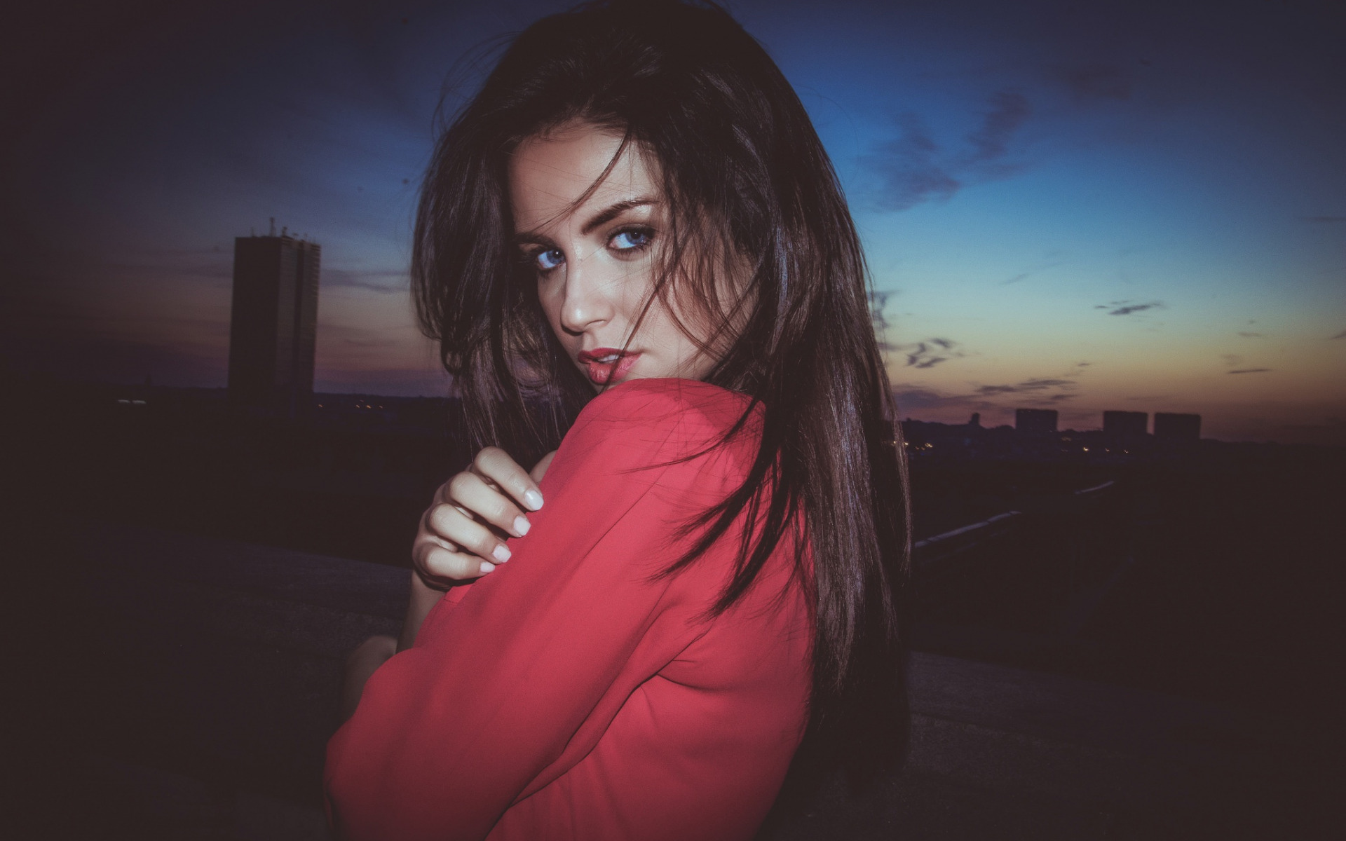 Description: A woman in a red shirt is posing for a picture at sunset with her hair blowing in the wind.