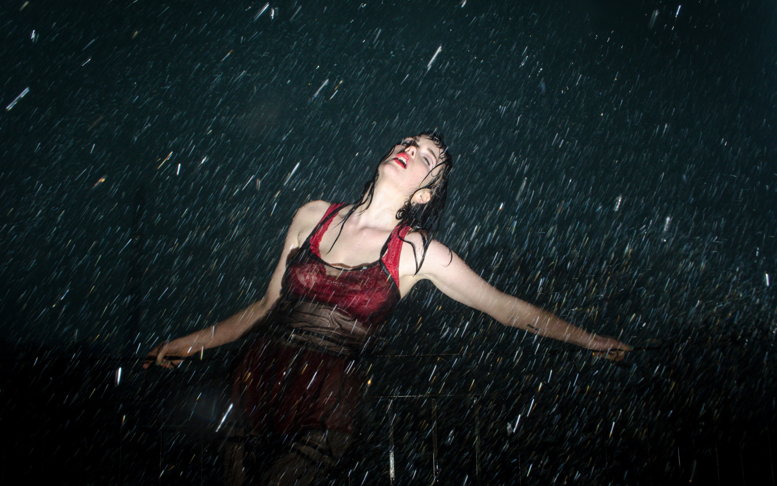 Description: A woman in a red top is standing in the rain with her arms outstretched and eyes closed.