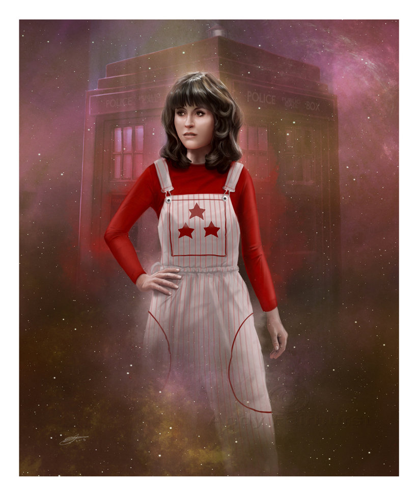 Description: A woman in a red and white dress standing in front of a tardish with a red star on it.