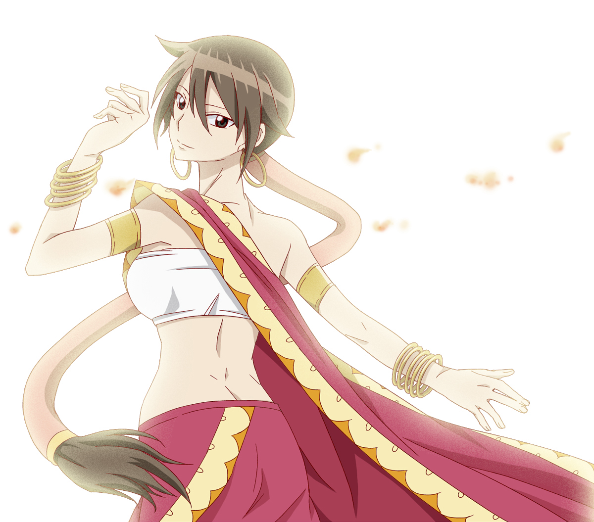 Description: A woman in a red and yellow dress with her arms out and her hand on her head.