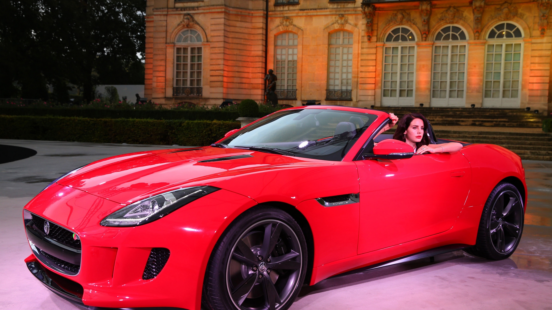 Description: A woman sitting in a red sports car in front of a building at night with a woman in the driver seat.