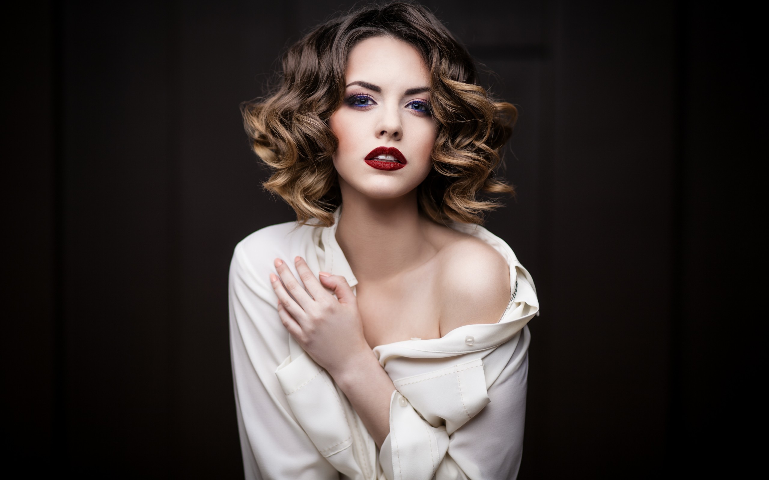 Description: A woman with a white shirt and red lipstick posing for a picture in a dark room with her hands on her chest.