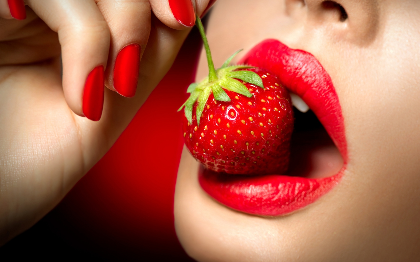Description: A woman with red nails and a strawberry on her lip is holding a strawberry in her mouth and a red lip.