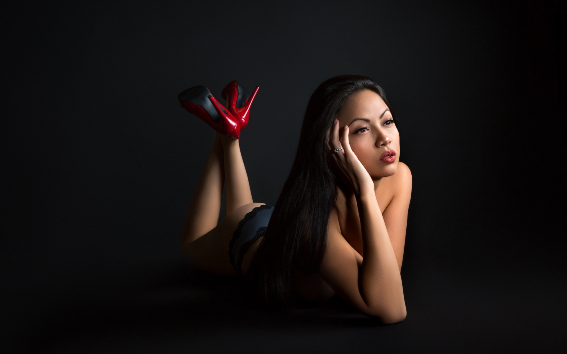 Description: A woman laying on the ground with a pair of red shoes on her feet and her hand on her face.