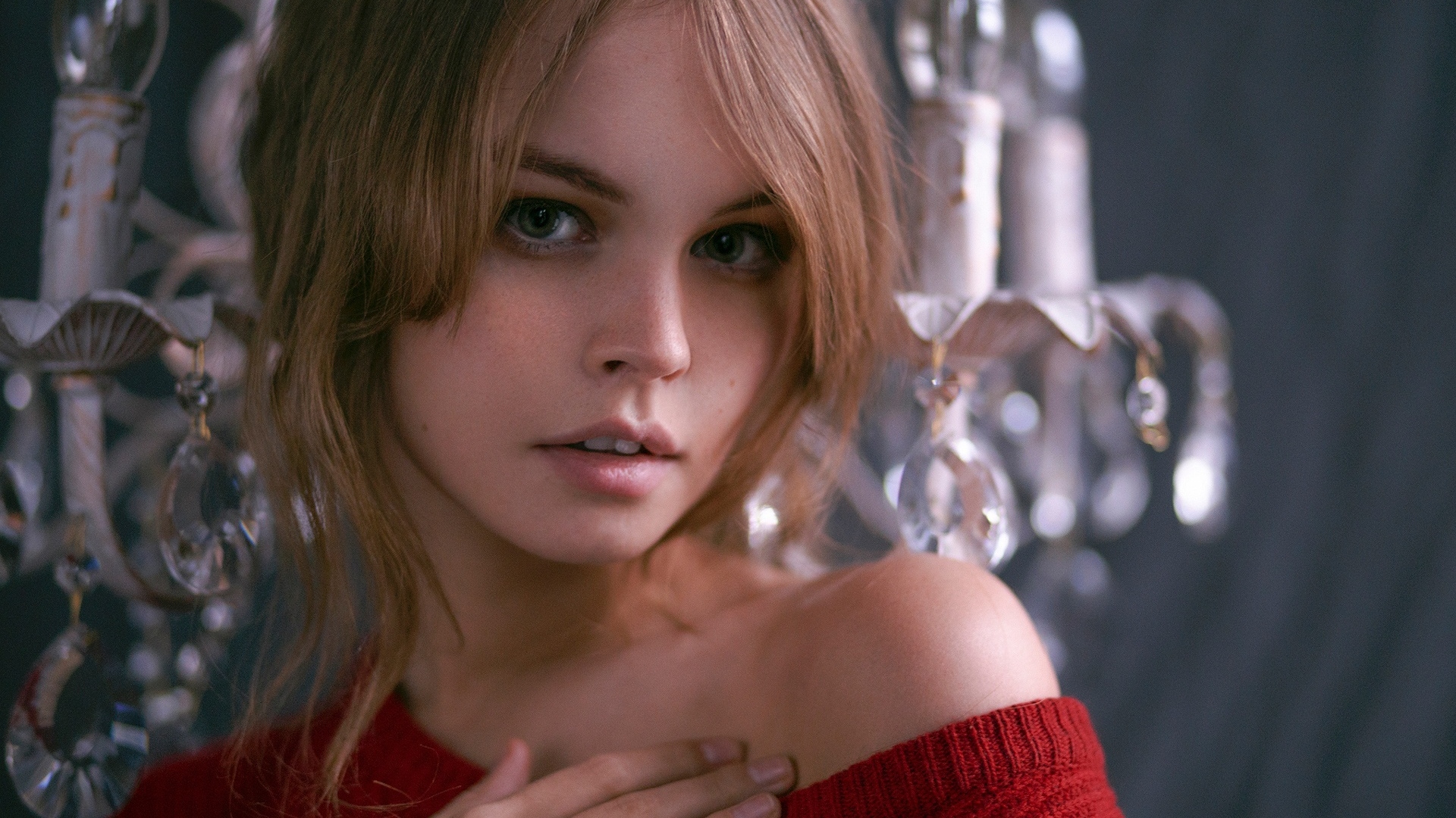 Description: A woman with a red sweater is posing for a picture with chains hanging from her head and hands on her chest.