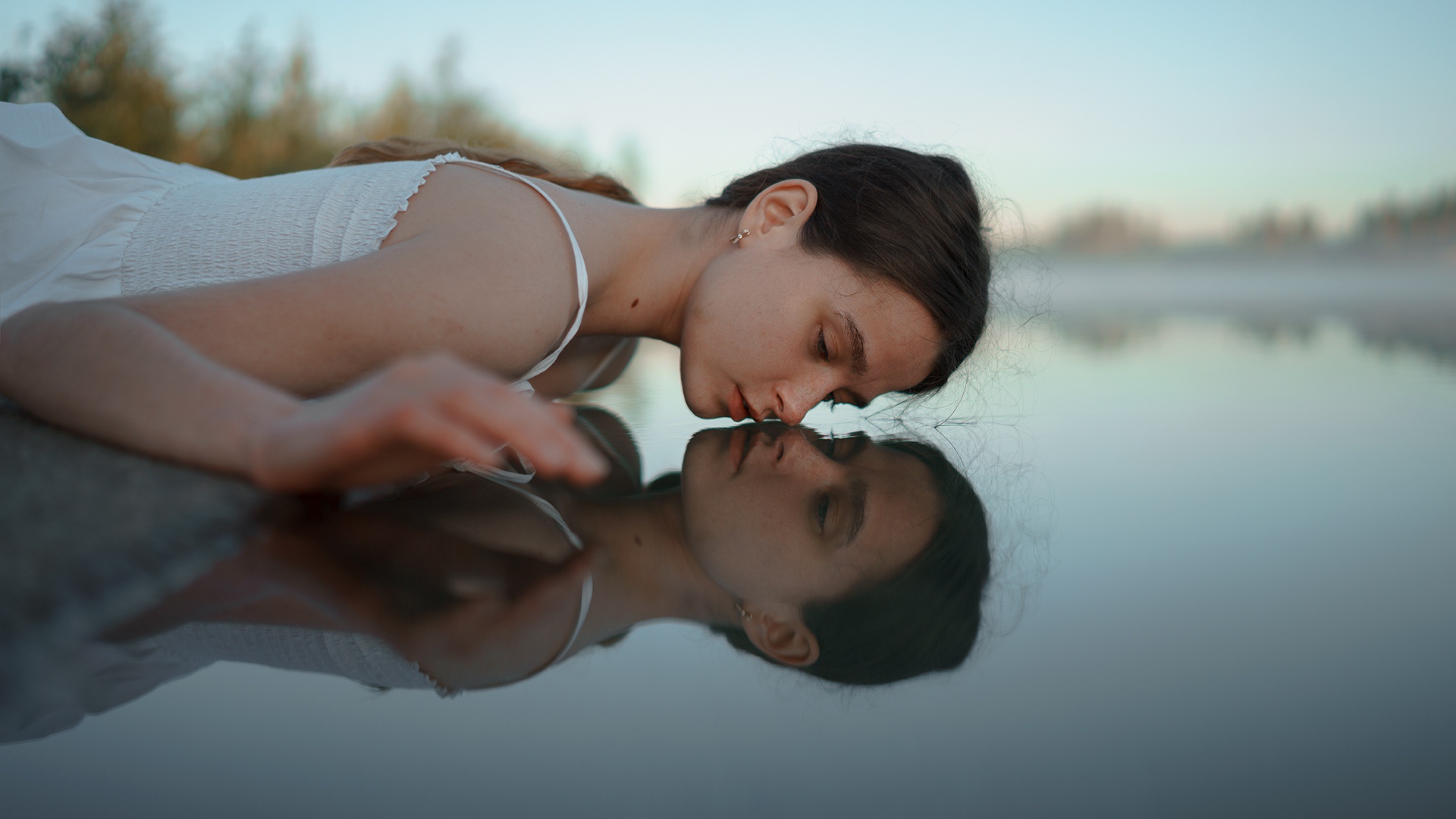 Description: A woman is leaning over a body of water with her head down and her eyes closed.