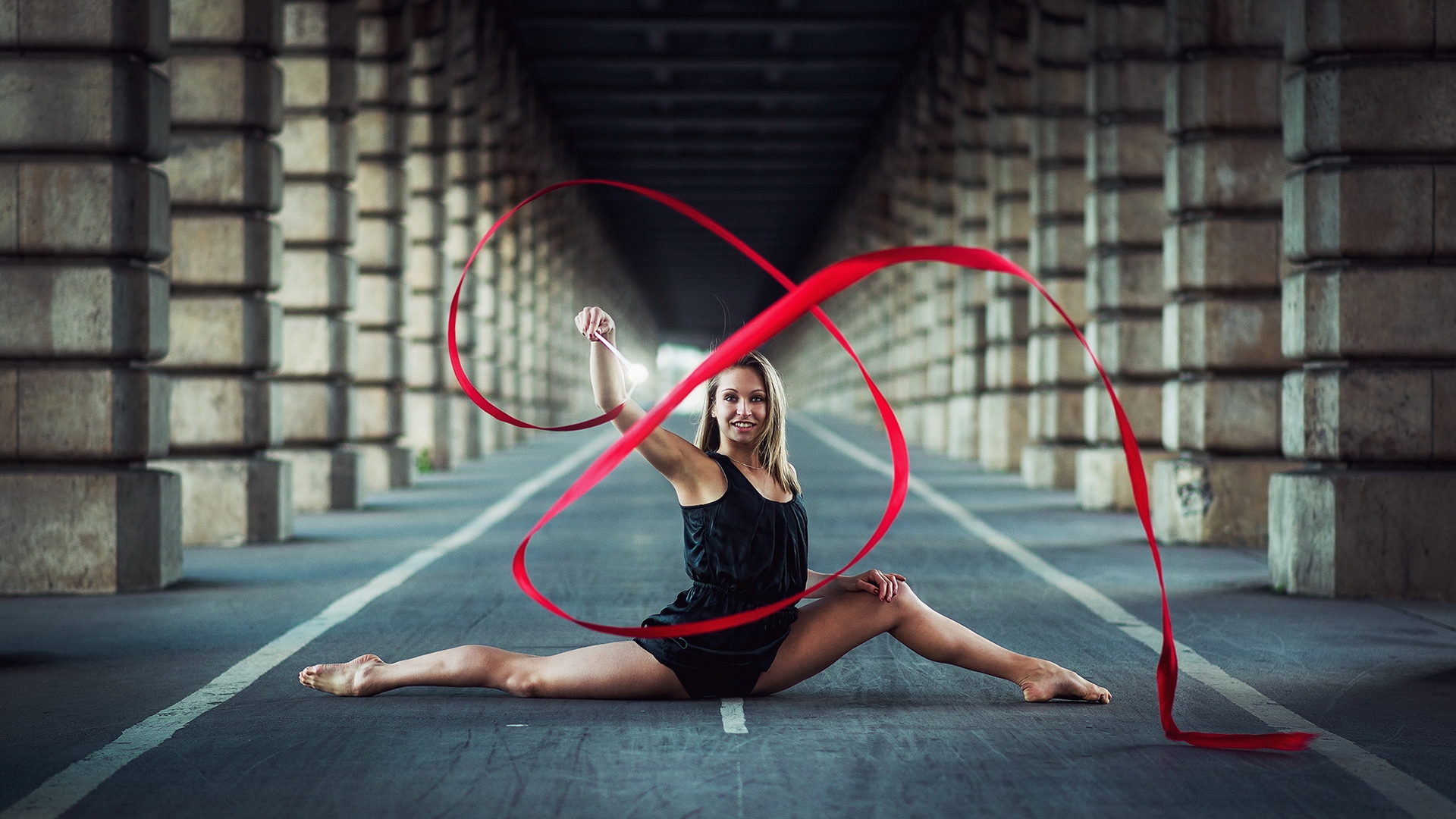 Description: A woman sitting on the ground with a red ribbon in her hand and a red ribbon in the air.