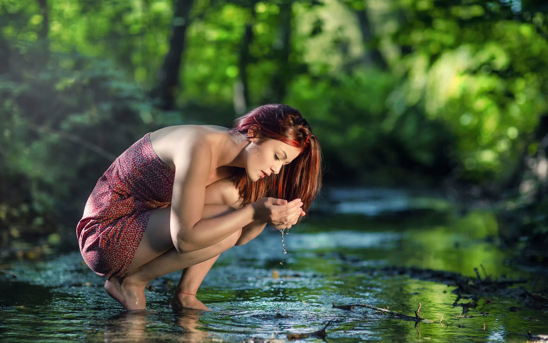 Description: A woman kneeling down in a river with a flower in her hand and a forest in the background with green leaves.