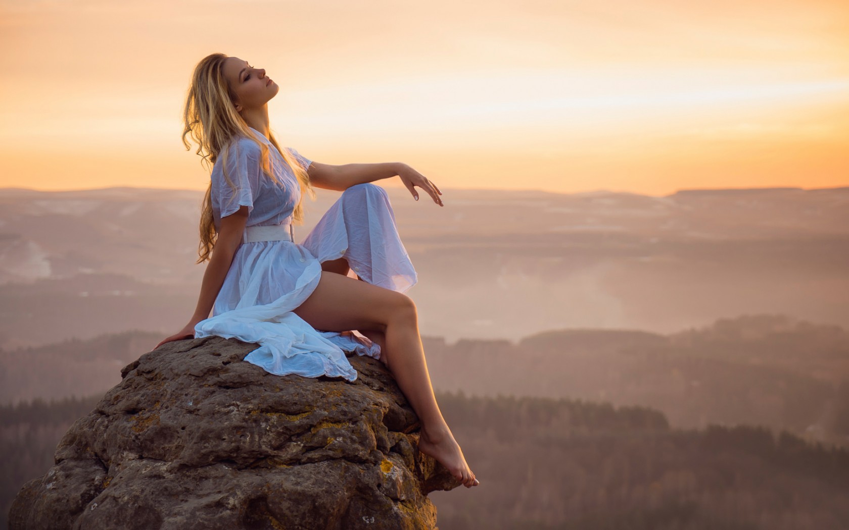 Description: A woman sitting on top of a rock with her legs crossed and her legs crossed.