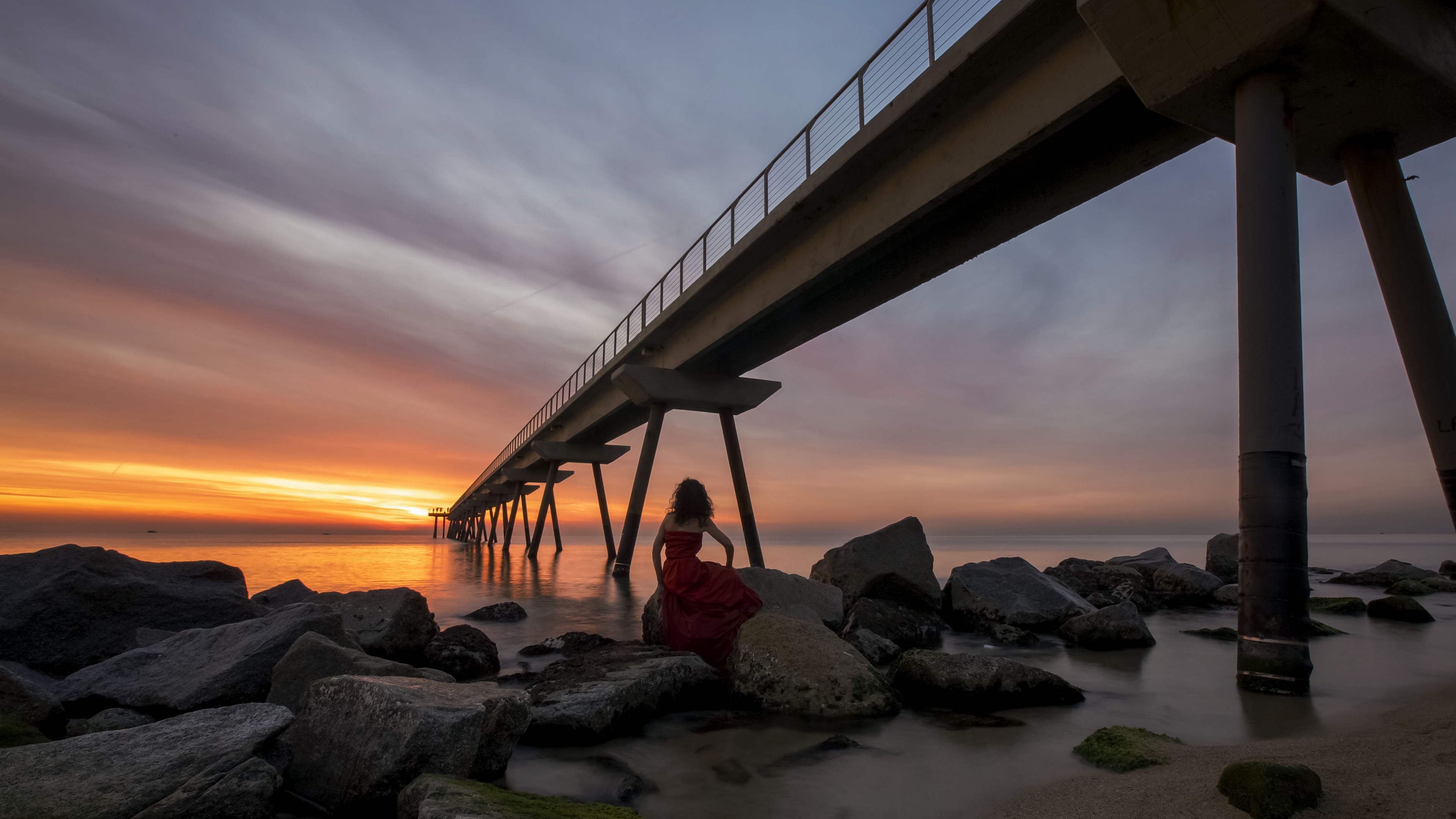 Description: A woman sitting on rocks under a bridge at sunset with a view of the ocean and a pier in the background.