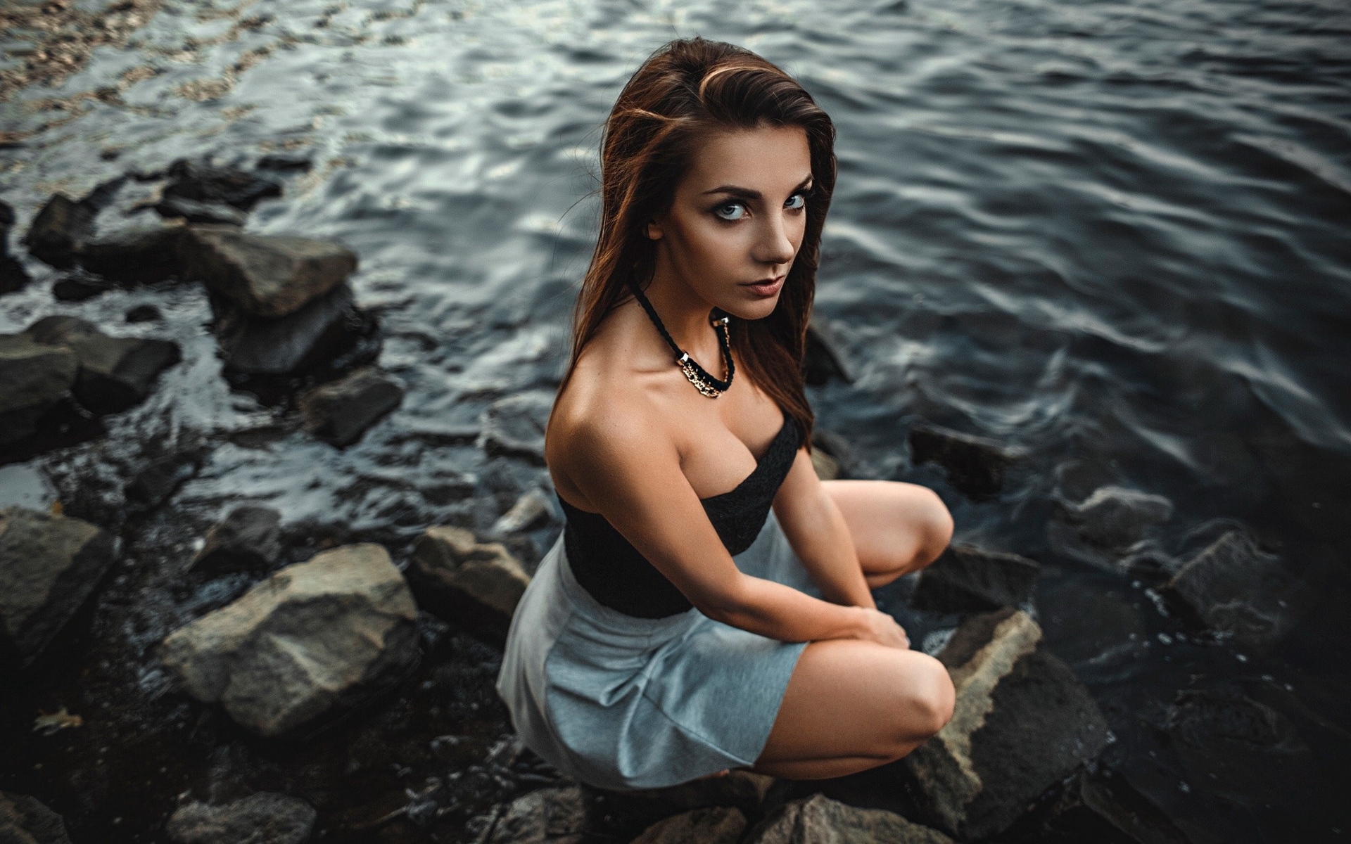 Description: A woman sitting on rocks near a body of water with her eyes closed and her hair in a bun.