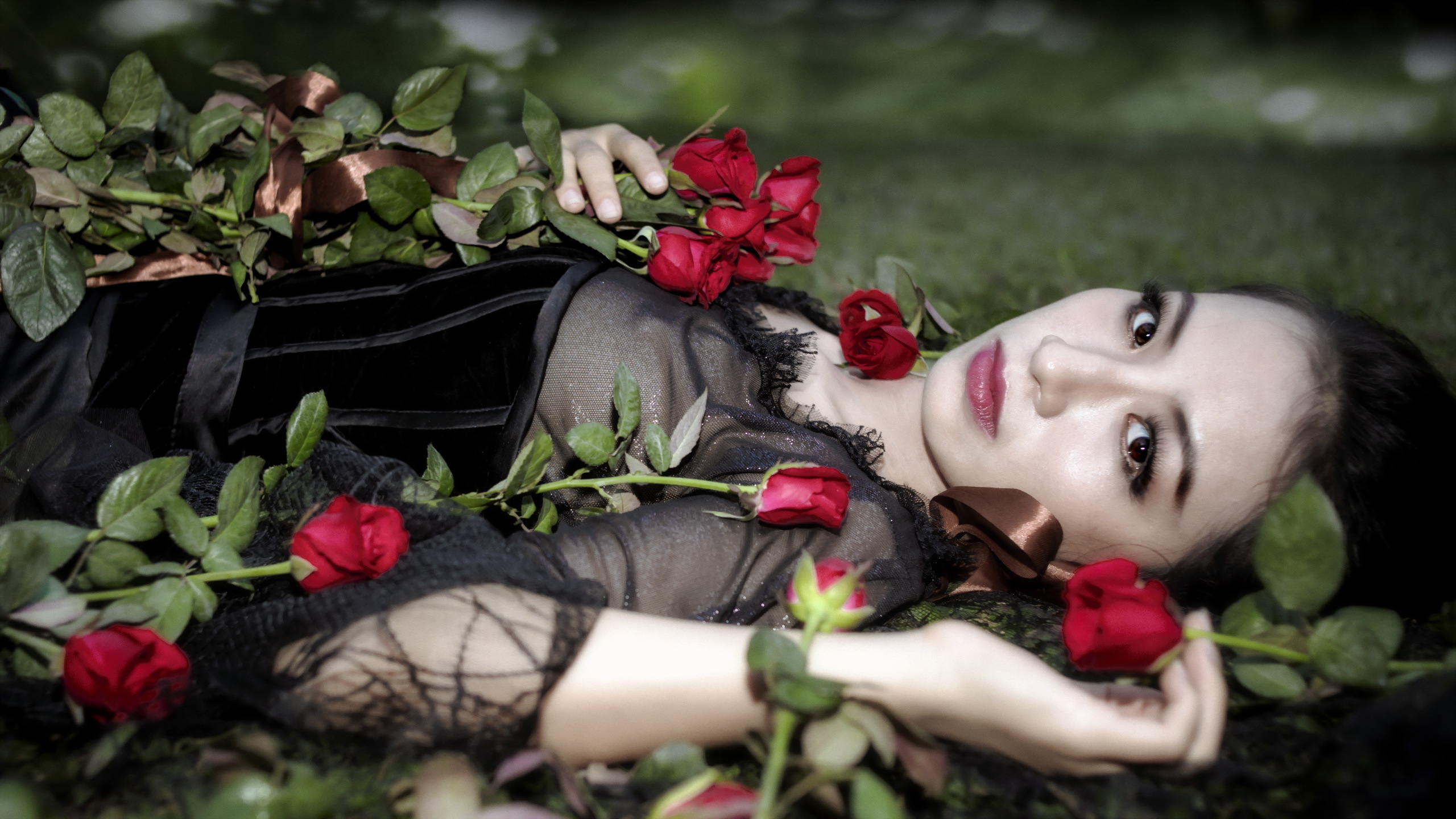 Description: A woman laying on the ground with roses in her hand and a black dress on her chest and a black veil on her head.