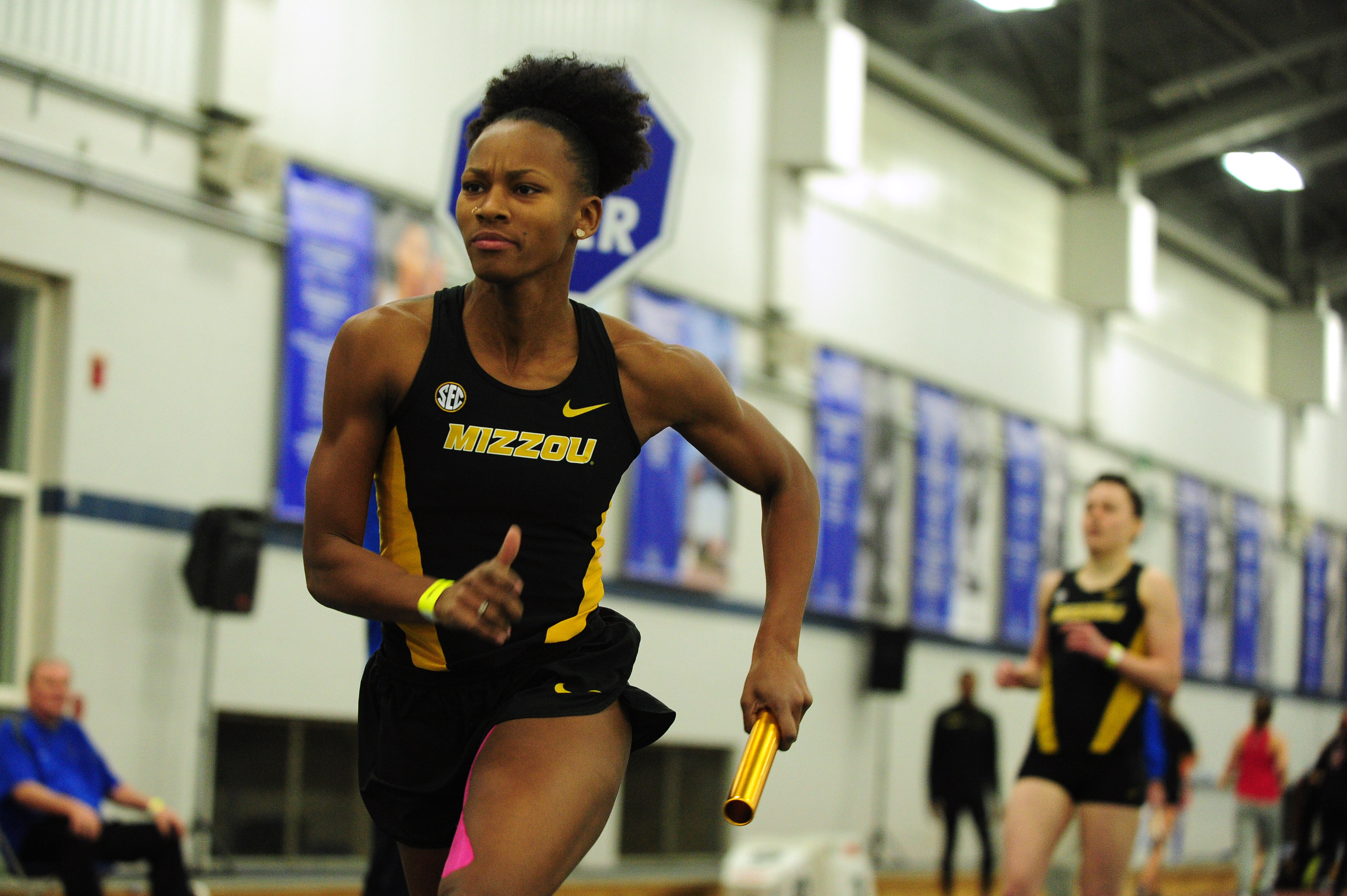 Description: A woman running in a gym with other people watching her from the sidelines and a man in the background.