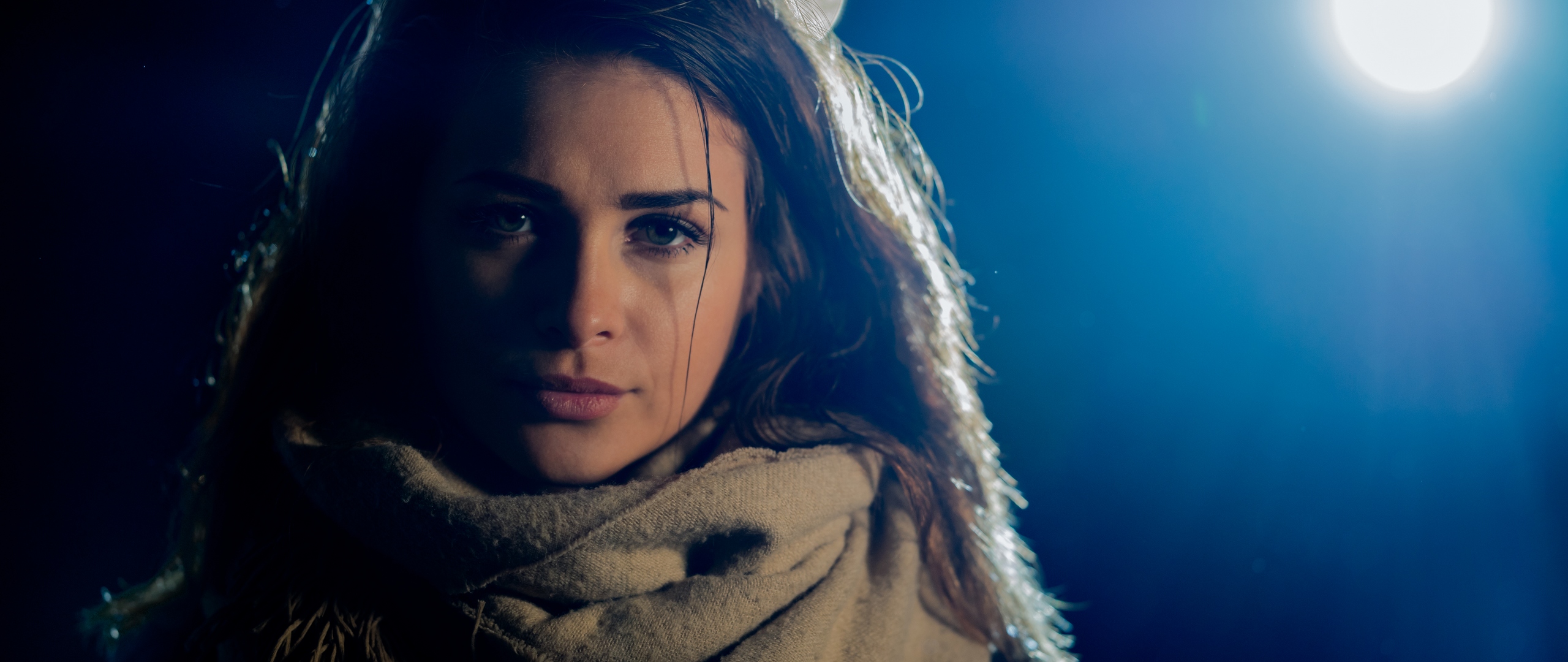 Description: A woman with a scarf around her neck looking at the camera with a bright light behind her and a spotlight behind her.