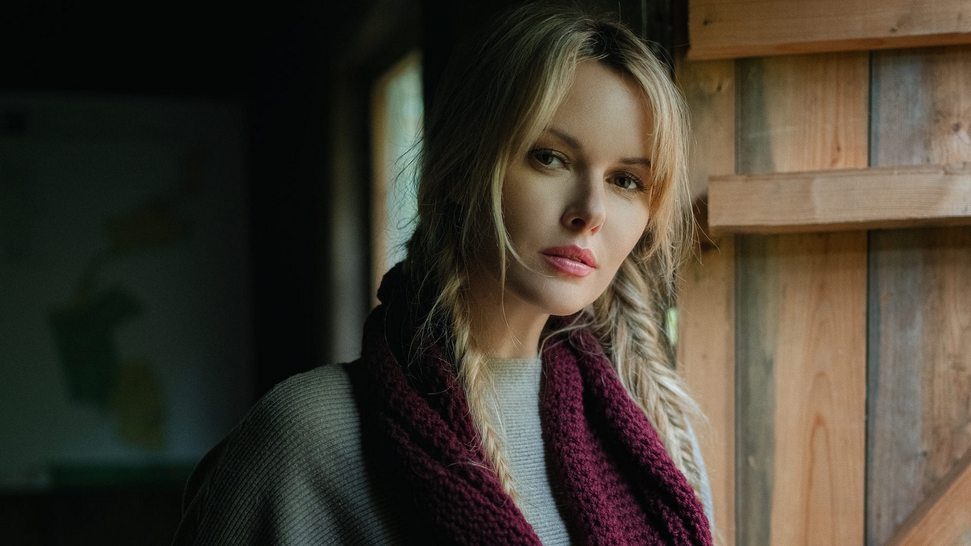 Description: A woman wearing a scarf standing next to a wooden wall with a window behind her and looking into the camera.