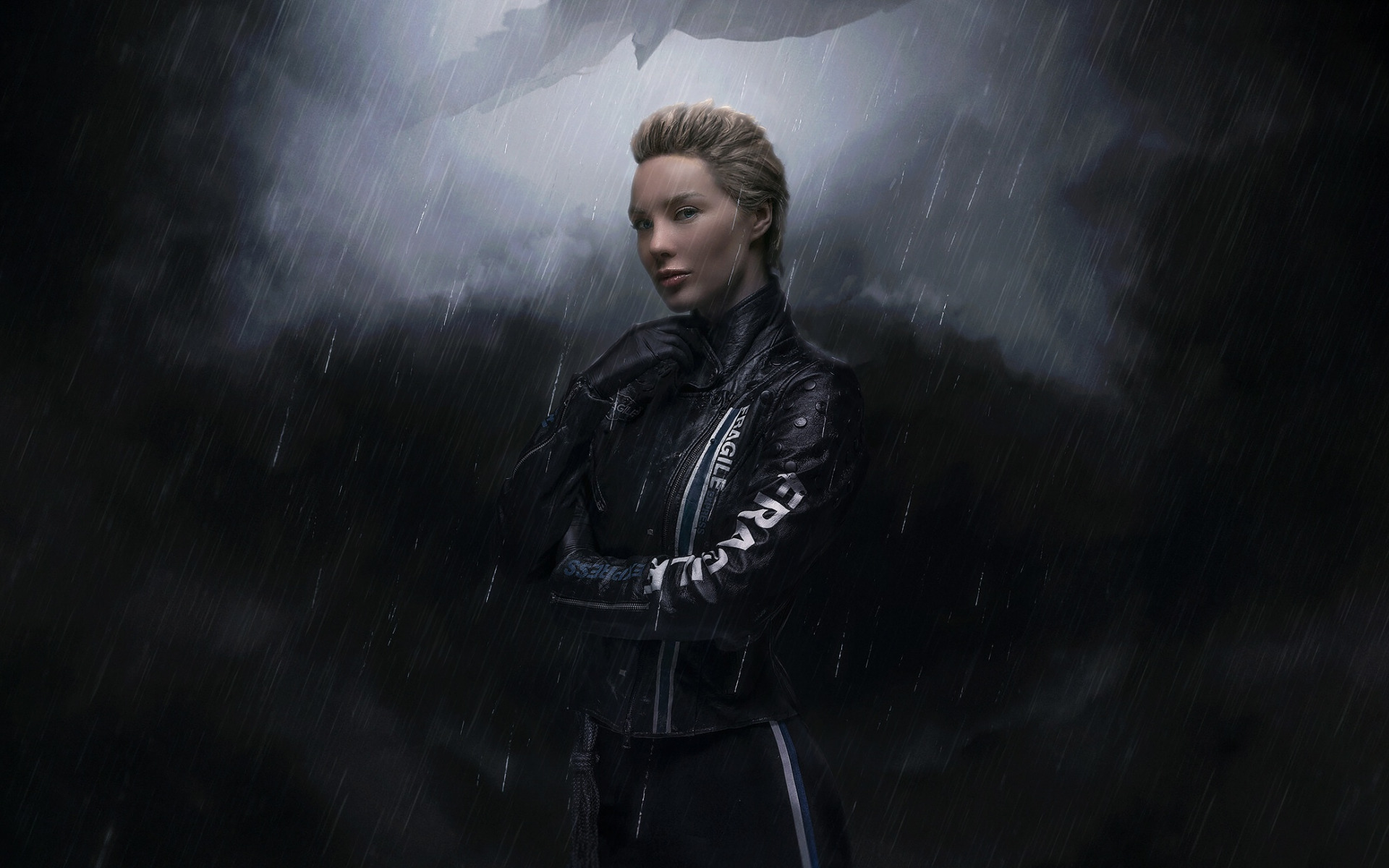 Description: A woman in a wet suit standing in the rain with a shark in the background in a dark.