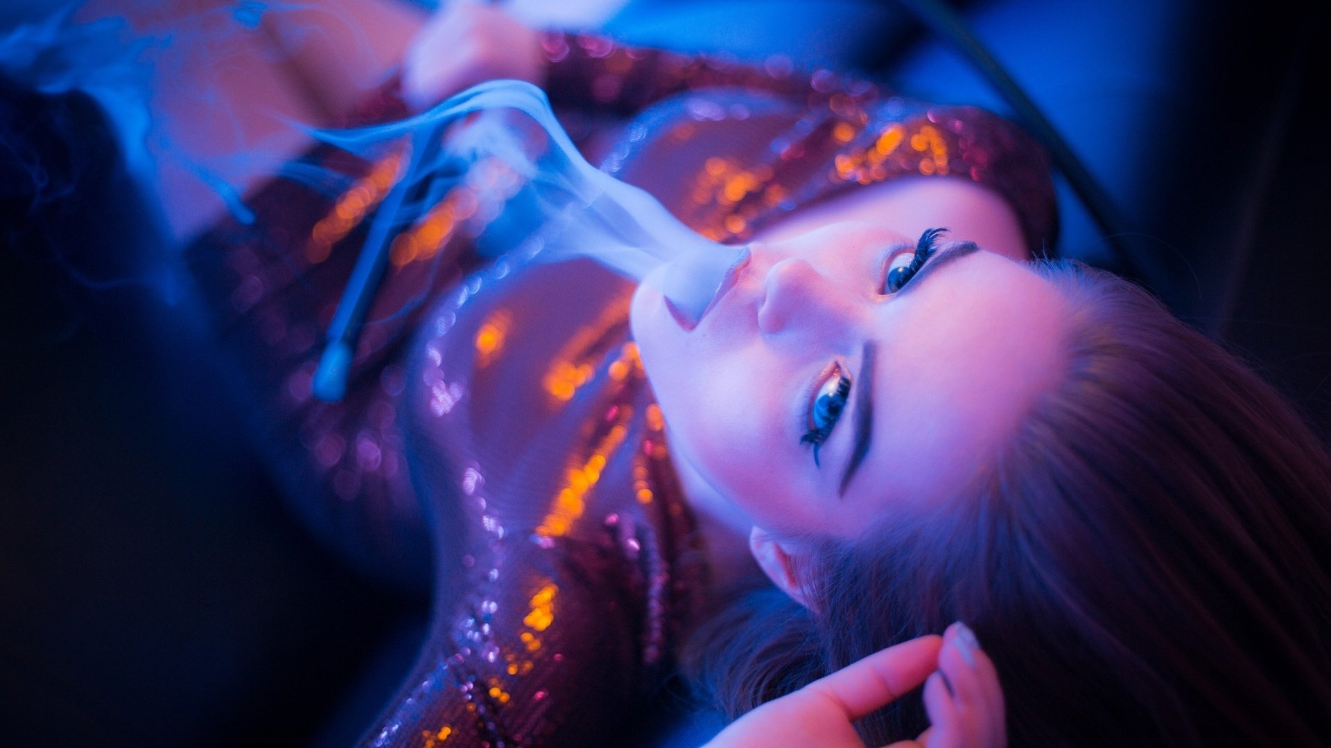 Description: A woman in a shiny dress laying down on a couch with her eyes closed and her hand on her chin.
