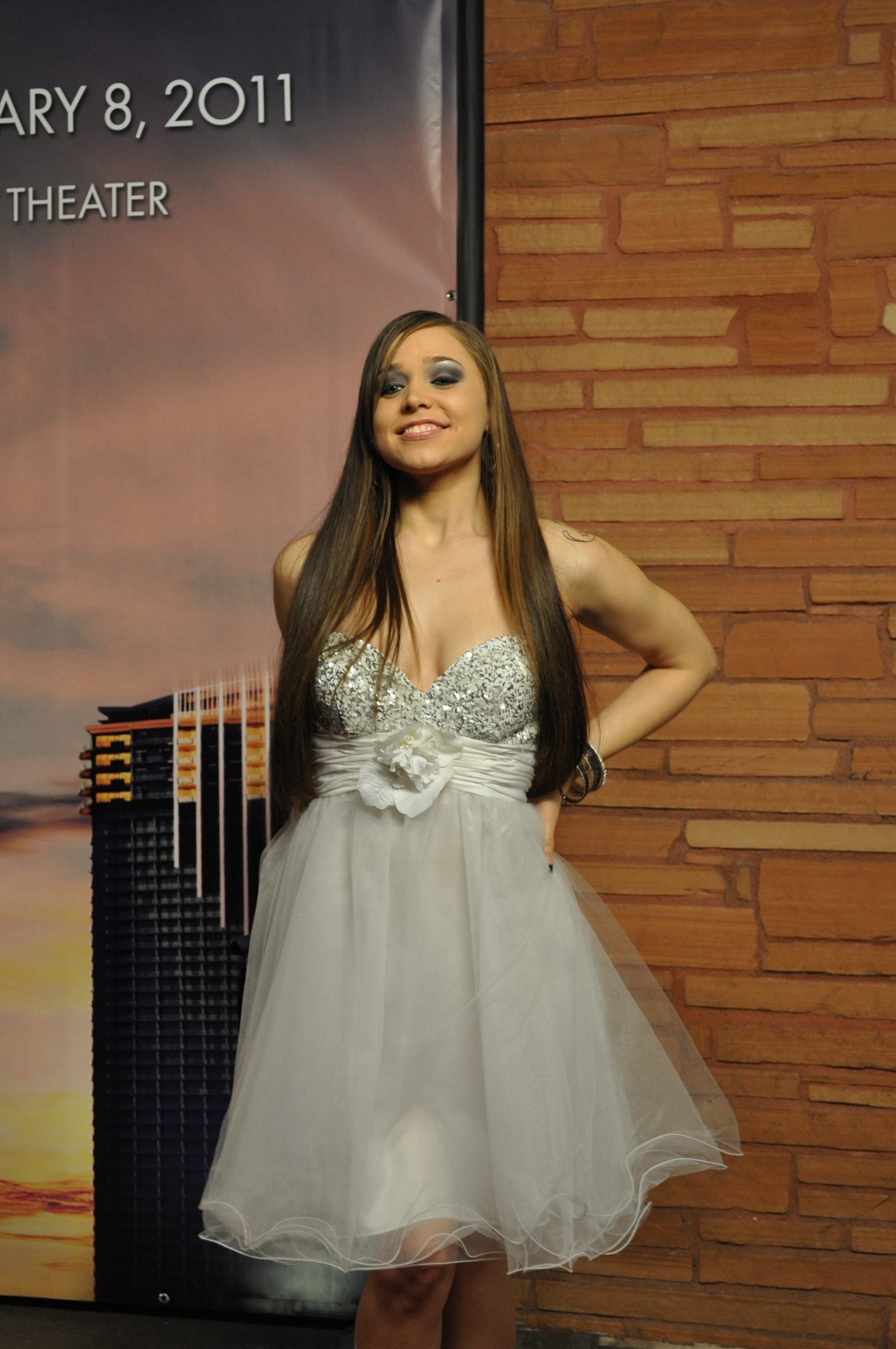 Description: A woman in a short dress standing in front of a poster of a cityscape and a building.