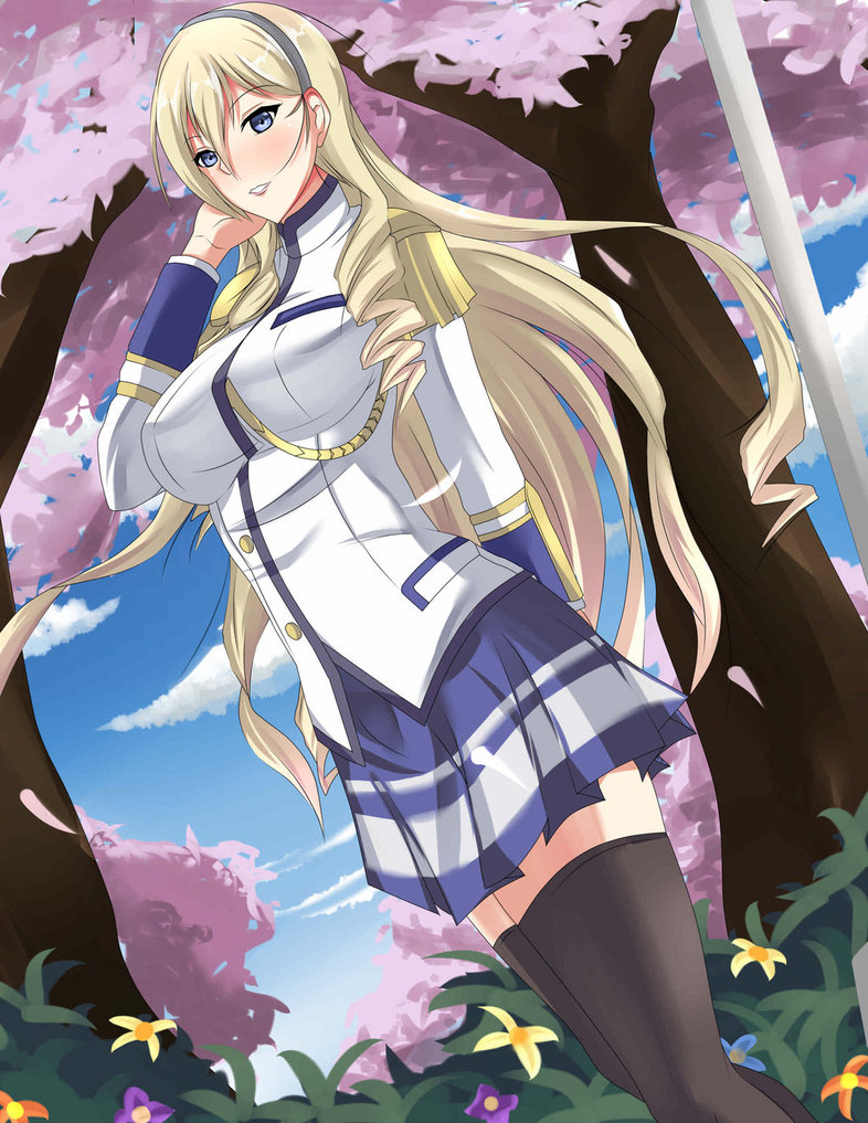 Description: A woman in a short skirt and boots standing in front of a tree with pink flowers and a sword.