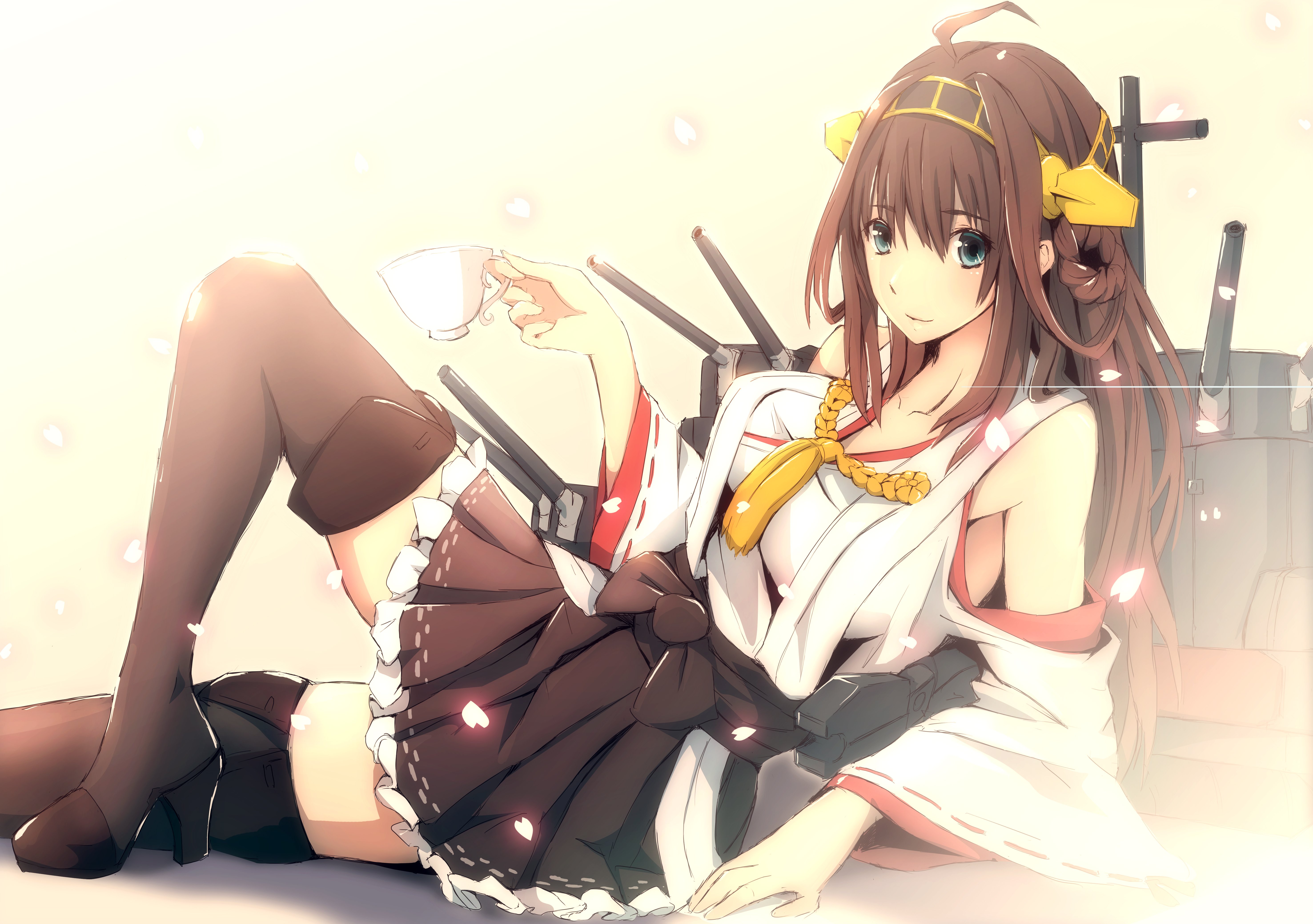 Description: A woman in a short skirt and a bow tie sitting on the floor with a cup of coffee in her hand.