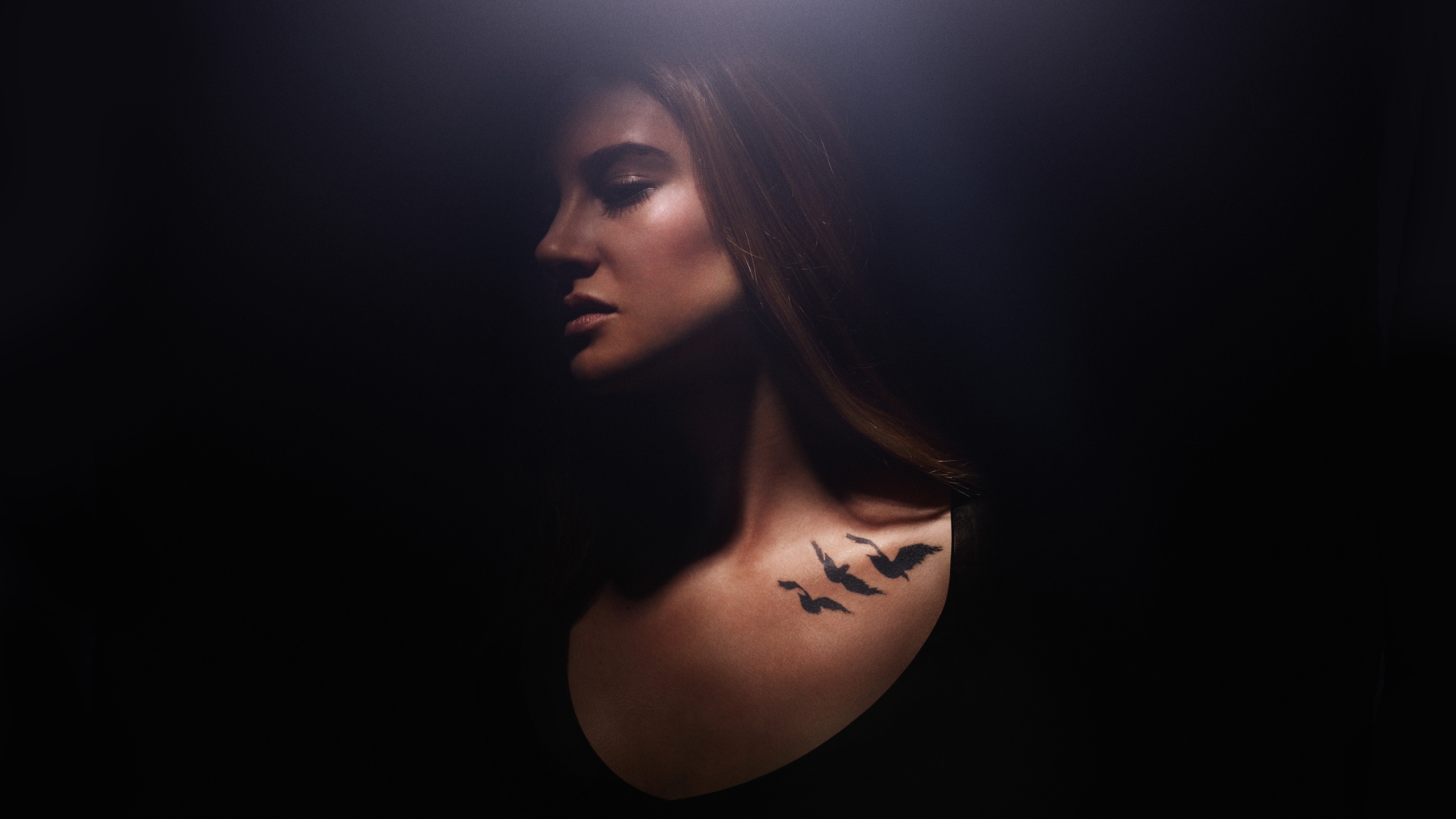 Description: A woman with a tattoo on her shoulder in the dark with a light shining on her shoulder and a bird on her shoulder.