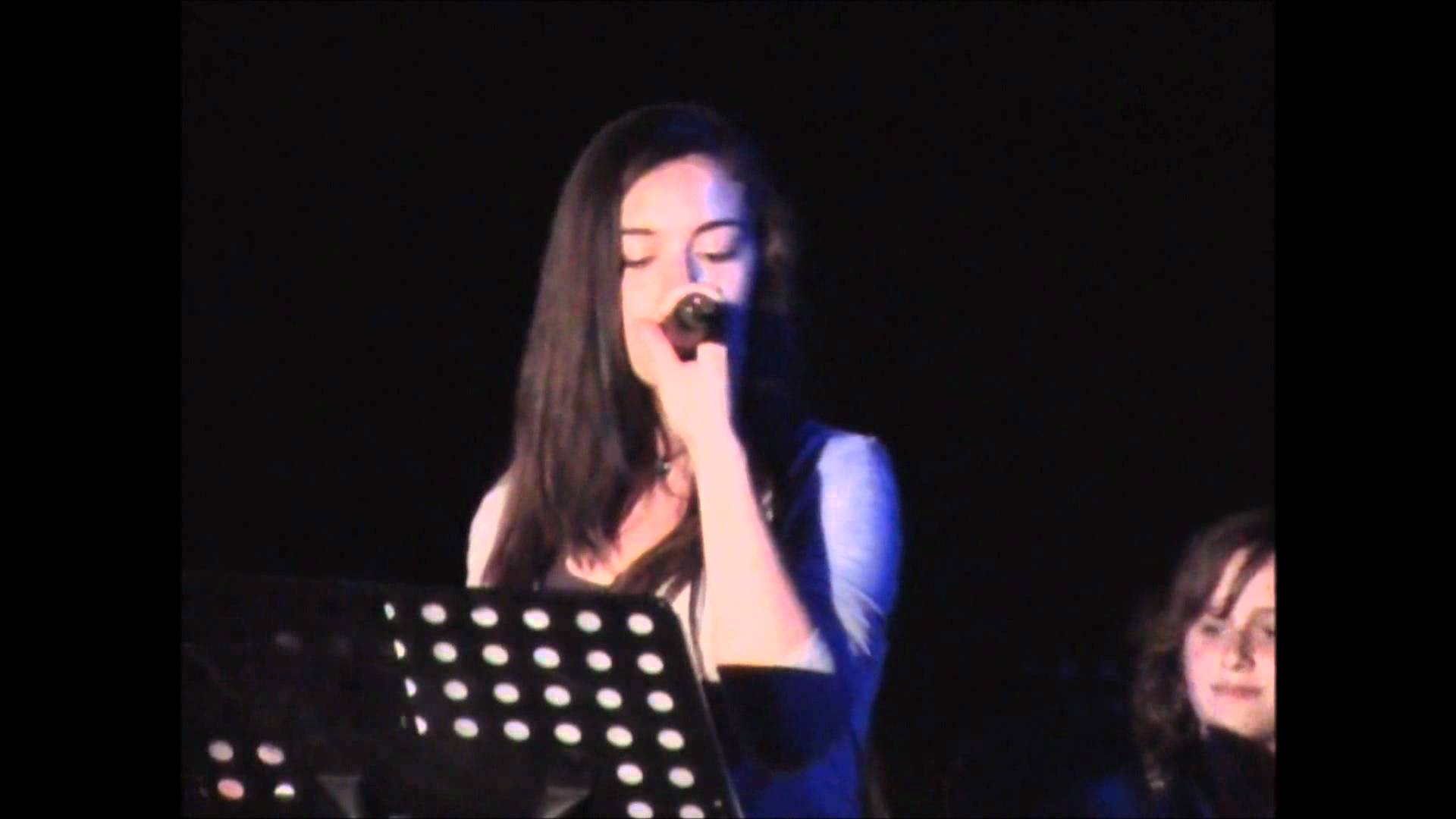 Description: A woman singing into a microphone while holding a keyboard in her hand and a microphone in her other hand.
